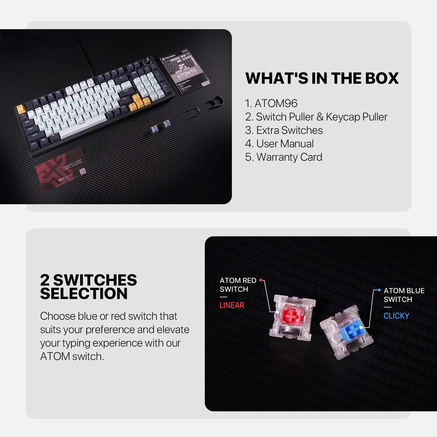 The Fantech ATOM96 MK890V2 Blue Switch RGB Gaming Mechanical Keyboard is a high-performance gaming keyboard built for gamers that value both style and utility. This wired Fantech ATOM96 MK890V2 Blue Switch Mechanical Keyboard has 96 keys and a complete key rollover. The mechanical blue switches provide a delightful tactile feel. It has anti-ghosting features for smooth gaming, guaranteeing that every keypress is detected correctly. The Fantech ATOM96 MK890V2 Mechanical Keyboard's programmable lighting system includes ten dynamic RGB settings, enabling you to personalize your setup with amazing color effects. Furthermore, the built-in multi-function knob lets you easily manage your music and modify the RGB brightness on the go, giving you quick access to important settings without disrupting your gaming. This Fantech Mechanical Keyboard's 3-pin hot-swappable function allows it to be used with a variety of switches, giving you more personalization options. It has double injection keycaps for durability and long-lasting legends that will not fade with time. The Mizu Edition has a 95% layout and a sleek, visually appealing appearance, emphasized by a distinctive three-color keycap combination. The ABS material design makes it lightweight but strong, and the adjustable feet offer a comfortable typing posture. The Fantech Keyboard measures 385 x 136 x 35.5 mm and weighs only 720g, making it small and portable. The Fantech ATOM96 MK890V2 Blue Switch RGB Gaming Mechanical Keyboard is a great option for gamers since it offers both performance and style, whether you're typing or gaming.
