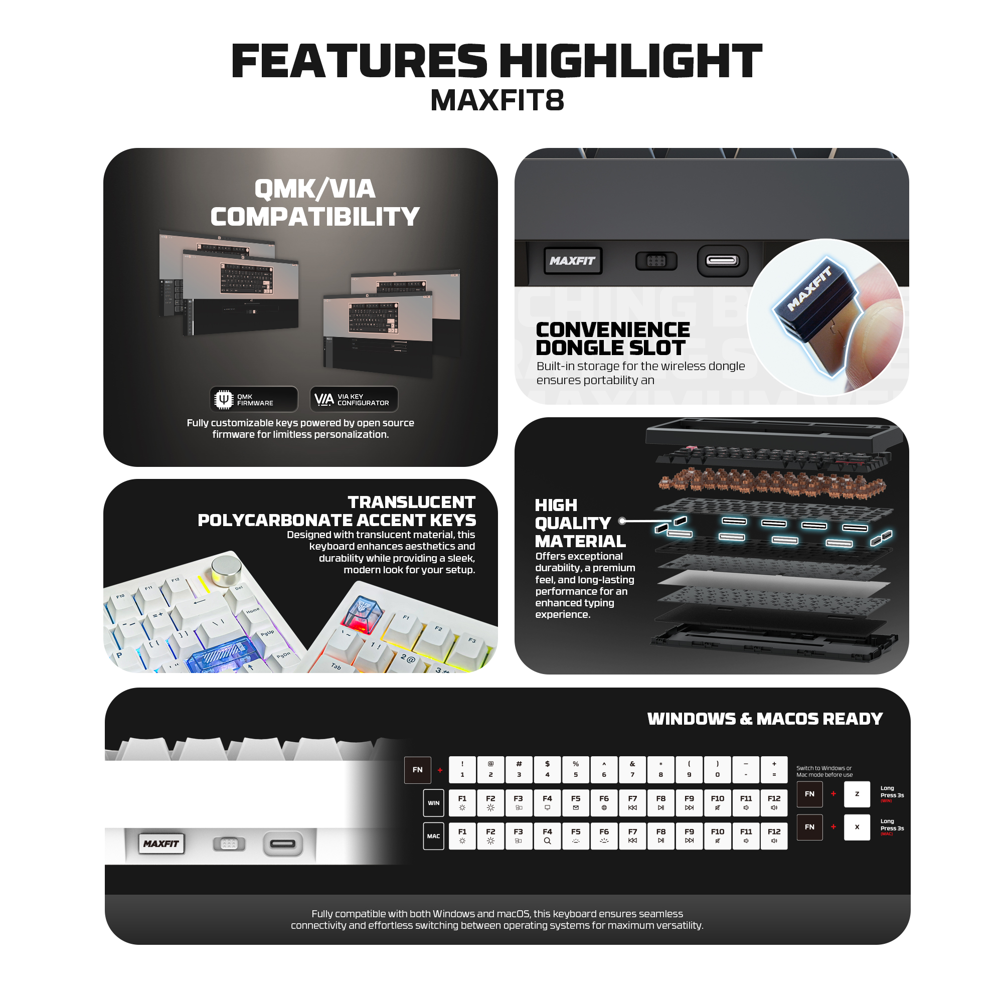 The Maxfit8's compact 80-key layout keeps essential keys like the function row and arrows, offering full functionality in a more compact form-perfect for work and play.