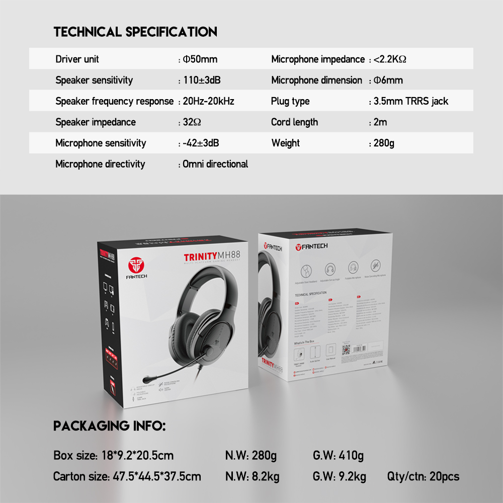 FANTECH MH88 TRINITY MULTI-PLATFORM GAMING HEADSET Noise Canceling 50mm Speaker Driver For PC, Laptop, Xbox, Playstation, Switch, Mobile, And Mac.