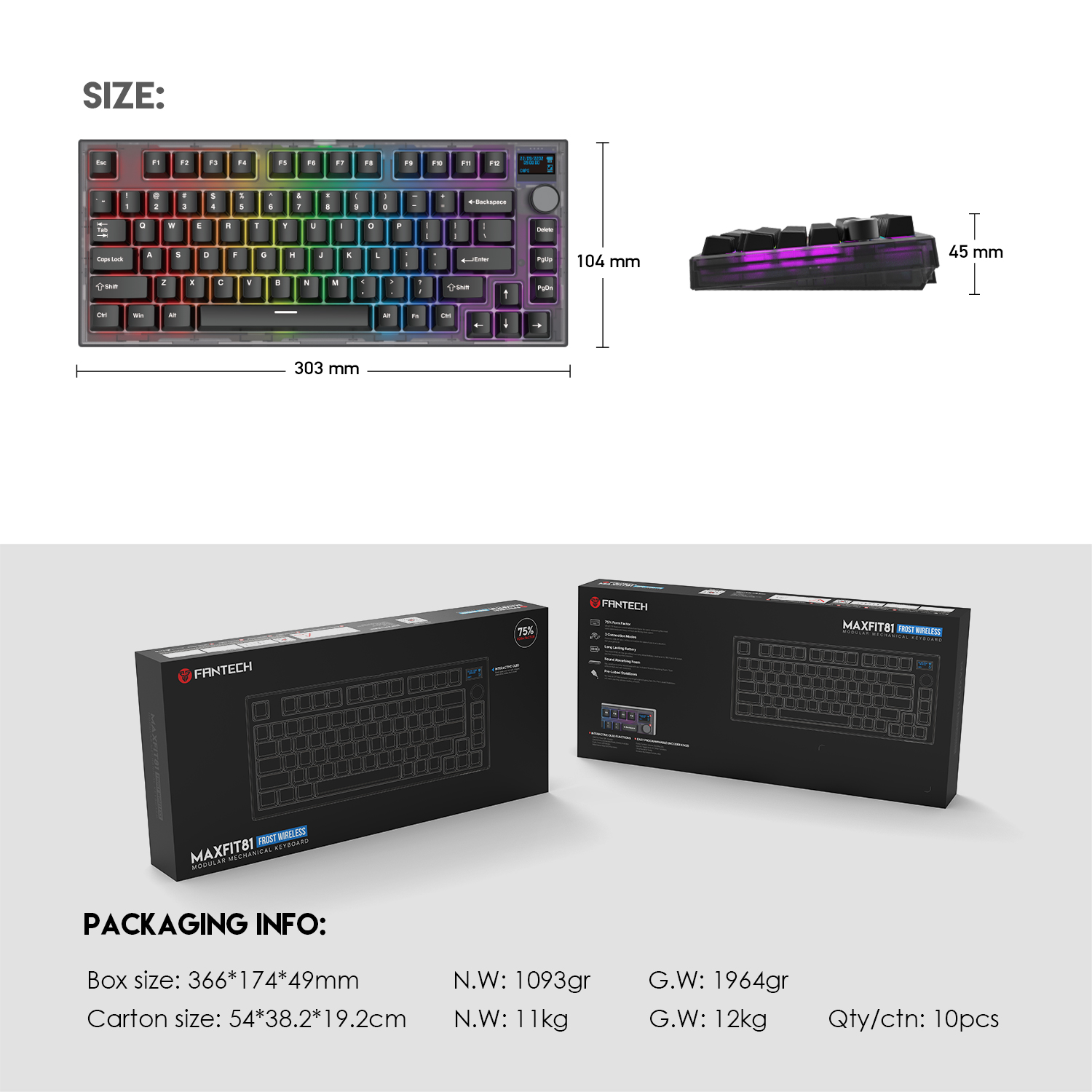 FANTECH MK910 MAXFIT81 ABS KEYCAPS FROST WIRELESS MODULAR MECHANICAL KEYBOARD WIRED 2.4Ghz & BT 5.2 WIRELESS OUTEMU BLUE & RED SWITCHES