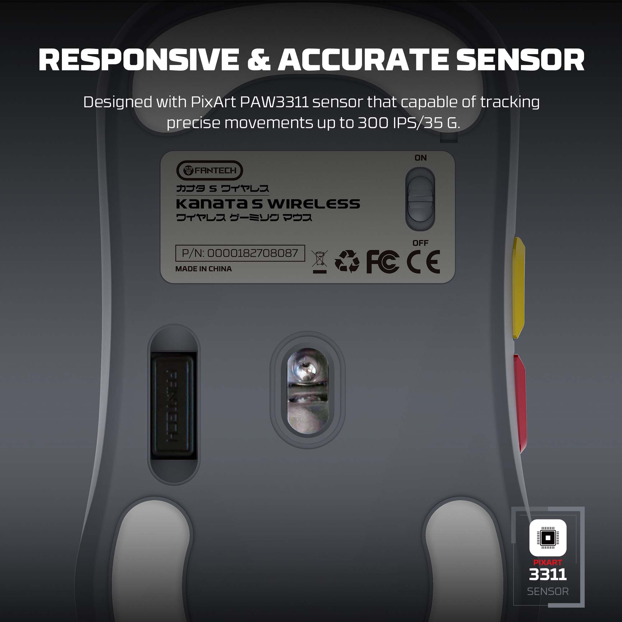 The Fantech Kanata S WG9S Wireless Gaming Mouse is a flexible and high-performance gaming peripheral tailored to the demands of competitive players. The Huano Blue Shell White Dots switches provide exceptional durability even under intense stress while staying swift and hyper-responsive. The mouse's PixArt PAW 3311 sensor provides precision tracking, capable of managing movements up to 300 IPS and 35 G acceleration, making it both responsive and accurate for any gaming environment. The WG9S Gaming Mouse supports both wired and StrikeSpeed wireless networking, ensuring a smooth and steady gaming experience with no delay, latency, or connection loss. The 1000 Hz polling rate provides smooth and responsive performance, while the lightweight design of 89 ± 1 gram improves mobility. The built-in 300 mAh battery, with a 3.7V rating, lasts up to 70 hours of playtime. The Fantech WG9S Gaming Mouse offers personalization+, which allows players to download software from www.fantechworld.com to change button assignments, macro editing, DPI stages, and report rates. All customizations may be stored in the onboard memory for a more personalized gaming experience. The Kanata S WG9S Mouse measuring 123×67×44 mm offers ergonomics, durability and sophisticated functionality making it ideal for gamers seeking accuracy and dependability.