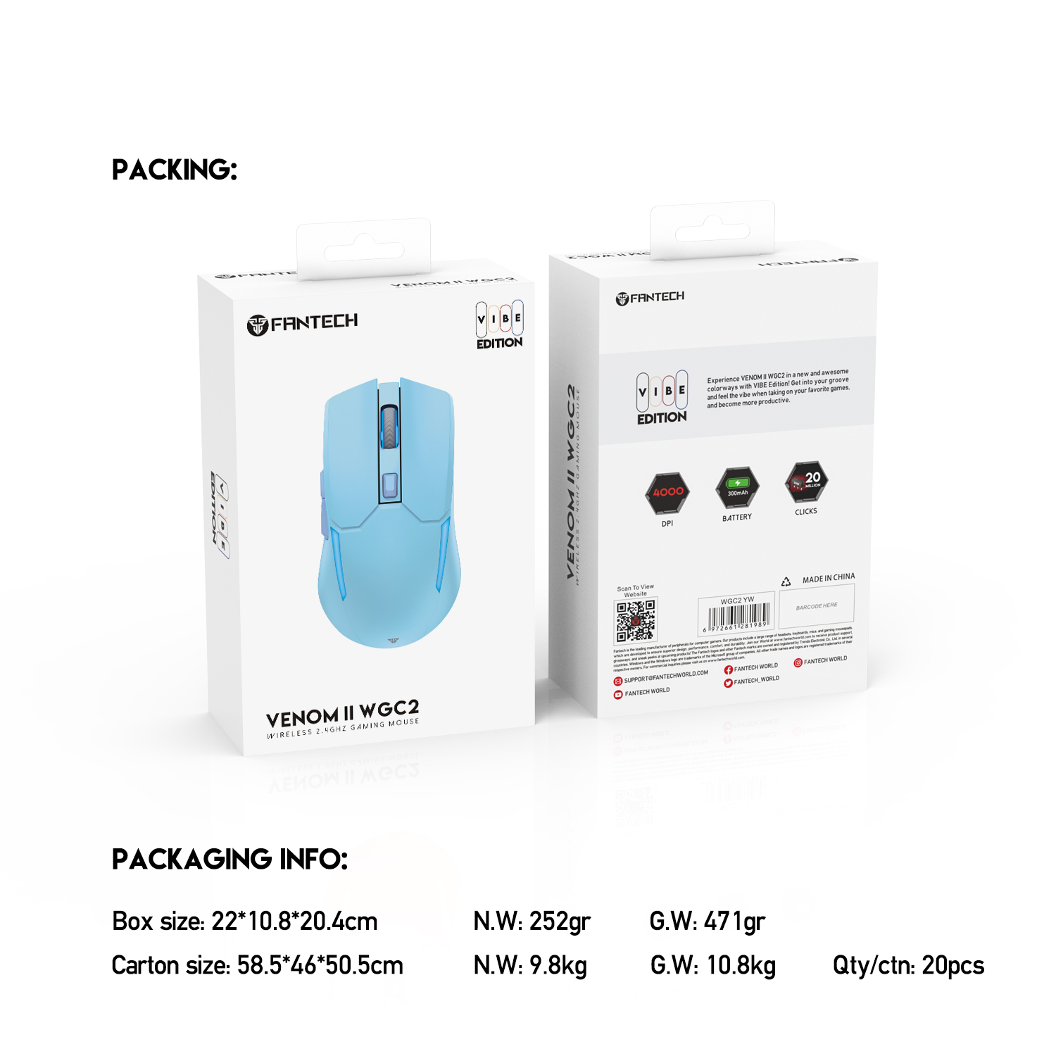 The Fantech VENOM II WGC2 BLUE Mouse comes with a PixArt 3212 Gaming Sensor that guarantees that even the slightest motions from this wireless mouse are reliably recorded. This gaming mouse has an ambidextrous shape. You may have a long-lasting gaming experience with an excellent battery saver option. As it is equipped with an intelligent power saver function, allowing for a long-lasting experience when gaming. With this mouse's RGB LEDs, which can be adjusted to 16.8 million colors, you can easily customize your gaming experience. The Fantech WGC2 is designed to be energy efficient, allowing you to play for up to 40 hours on a single charge, ensuring that your gaming is never interrupted. Its WGC2 has a dedicated DPI button, allowing you to change DPI on the fly without losing focus on your games. WGC2 skates are made of real PTFE for smooth movement. The Fantech VENOM II WGC2 BLUE Mouse comes with a 01-year warranty.