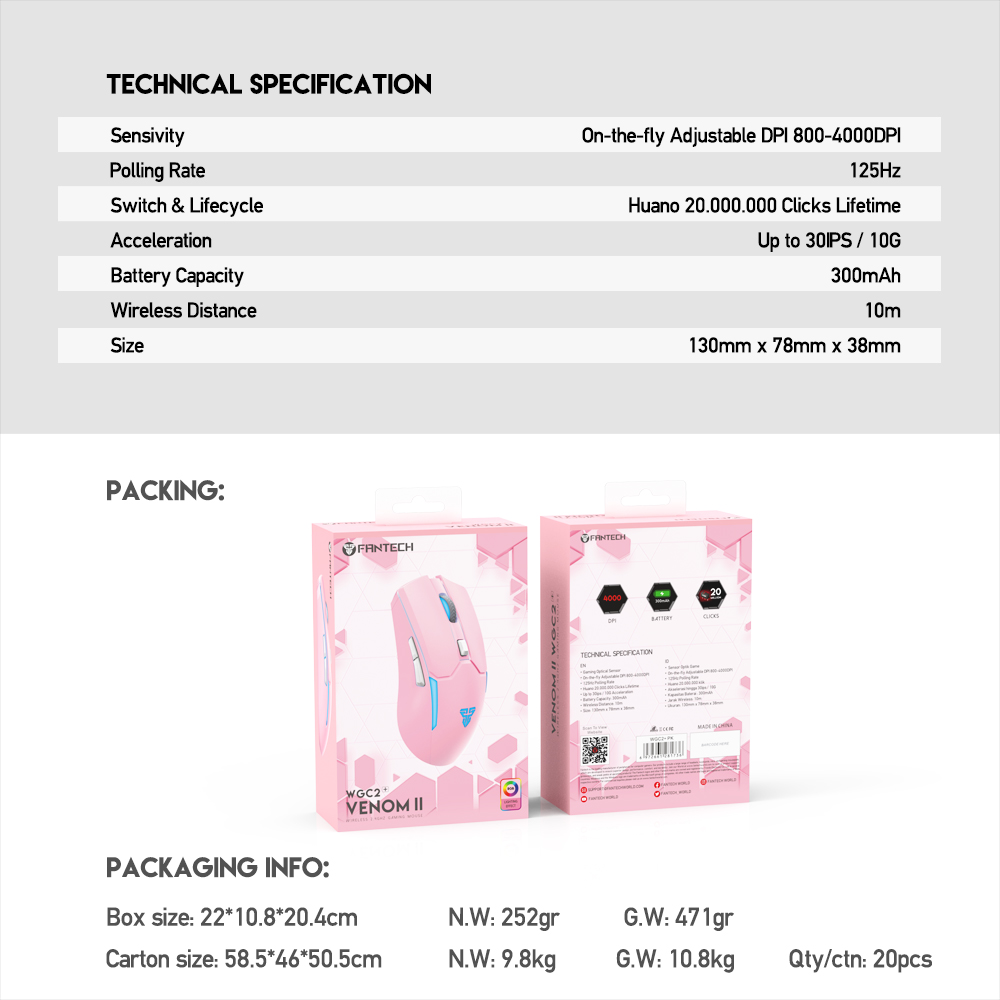 The Fantech VENOM II WGC2 PINK Mouse comes with a PixArt 3212 Gaming Sensor that guarantees that even the slightest motions from this wireless mouse are reliably recorded. This gaming mouse has an ambidextrous shape. You may have a long-lasting gaming experience with an excellent battery saver option. As it is equipped with an intelligent power saver function, allowing for a long-lasting experience when gaming. With this mouse's RGB LEDs, which can be adjusted to 16.8 million colors, you can easily customize your gaming experience. The Fantech WGC2 is designed to be energy efficient, allowing you to play for up to 40 hours on a single charge, ensuring that your gaming is never interrupted. Its WGC2 has a dedicated DPI button, allowing you to change DPI on the fly without losing focus on your games. WGC2 skates are made of real PTFE for smooth movement. The Fantech VENOM II WGC2 PINK Mouse comes with a 01-year warranty.
