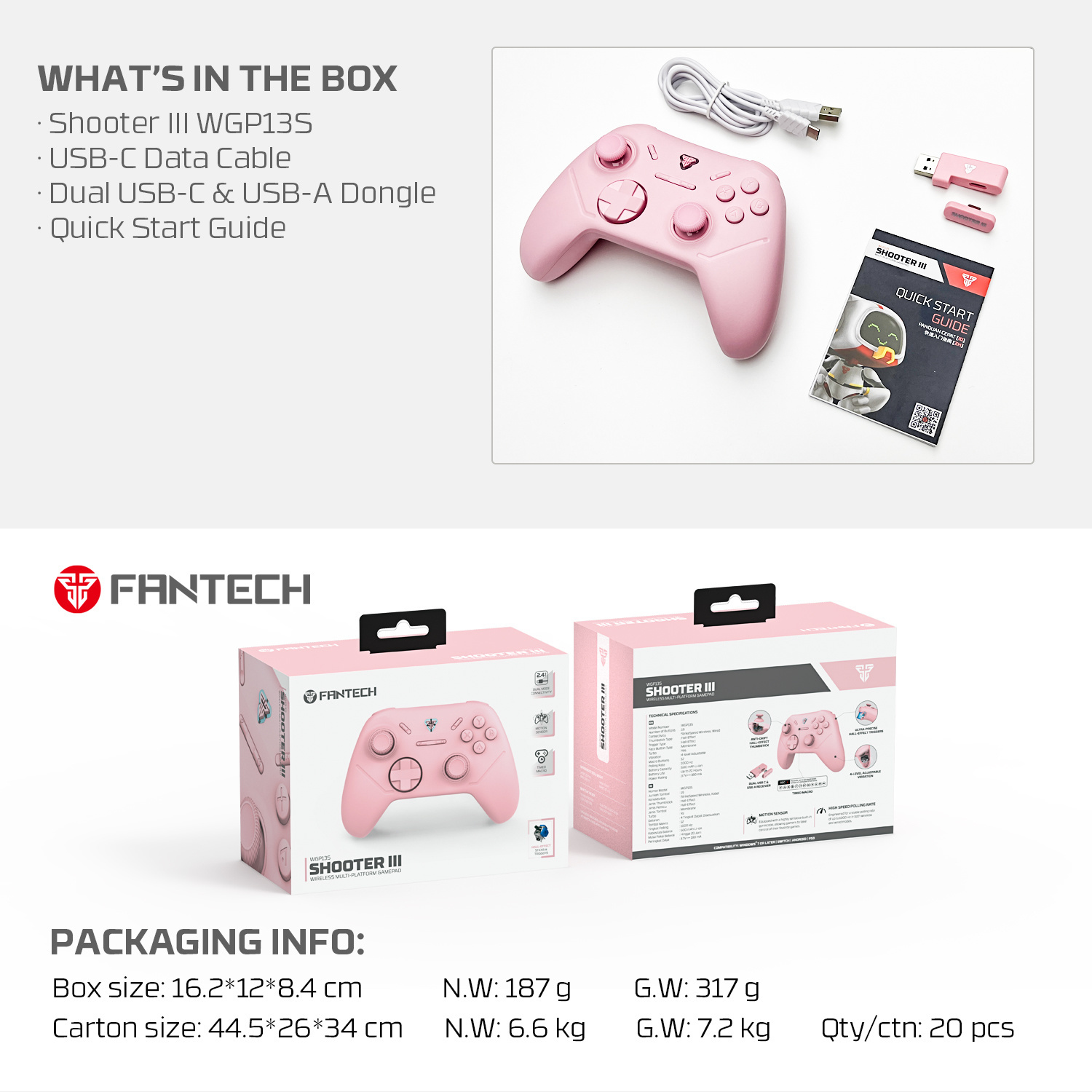 The Fantech WGP13S Shooter III Wireless Gamepad is intended for players that value precision and adaptability. It has 19 buttons in total, 12 of which are programmable, and allows for remarkable customisation for a more customized gaming experience. This Fantech Wireless Gamepad has StrikeSpeed Wireless and Wired connection, which ensures consistent performance across platforms. The thumbsticks and triggers use innovative Hall-Effect sensors for unrivaled accuracy, while the robust membrane face buttons deliver dependable input. Additionally, the customizable 4-level vibration and Turbo feature improve games immersion. The Fantech WGP13S Shooter III Gamepad is powered by a 600 mAh Li-ion battery and can provide up to 20 hours of continuous gameplay. The WGP13S Shooter III Fantech Wireless Gamepad has a 1000Hz polling rate, ensuring ultra-responsive control, making it an excellent choice for any gaming fan. For optimal performance and comfort, use the Fantech Wireless Gaming Controller.