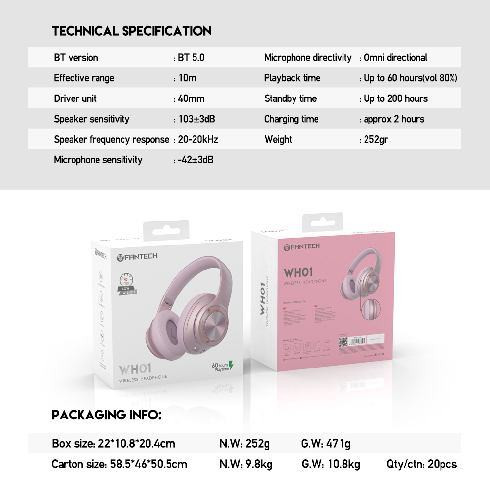 Fantech WH01 Wireless Headphone Over Ear Bluetooth 5.0 and 3.5mm Stereo Long Battery Foldable Headset Earphone Support for Phone