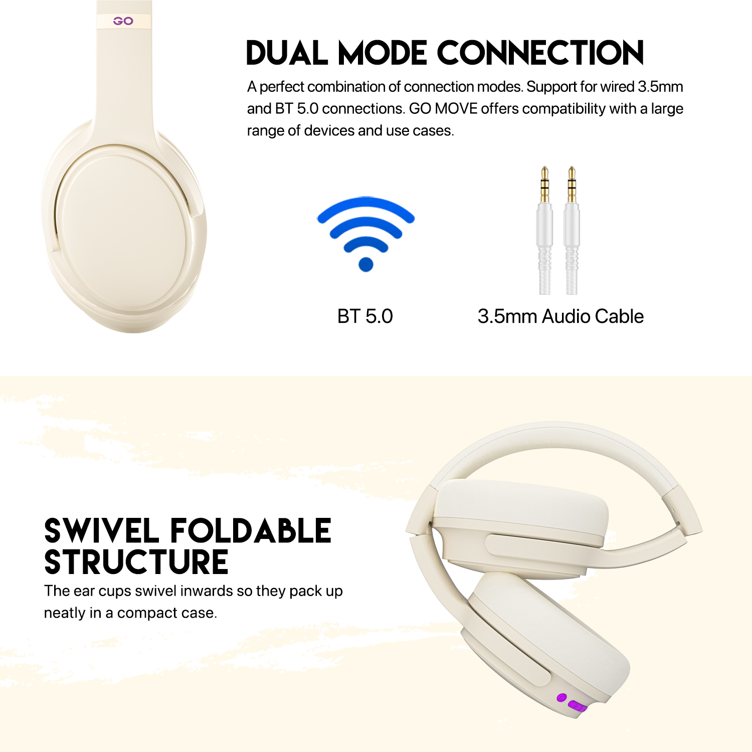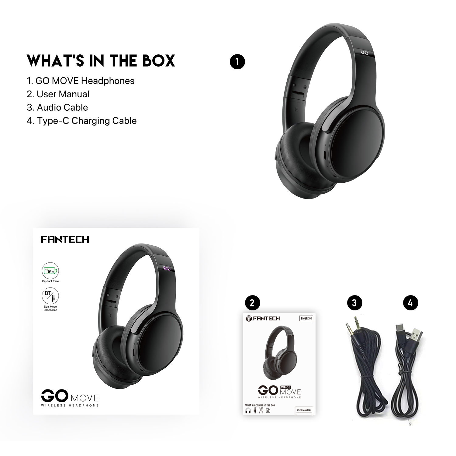 FANTECH WH03 GO MOVE WIRELESS BLUETOOTH HEADPHONE BTA 5.0 HEADSET EASY CONTROL BUTTON: Your music at your fingertips. Easy control of the volume, gaming mode, and skip through your music on the fly. DUEL MODE CONNECTION: A perfect combination of connection modes. Support for wired 3.5mm and BT 5.0 connections. GO MOVE offers compatibility with a range of devices and cases. SWIVEL FOLDABLE STRUCTURE: The ear cups swivel inwards so they pack up neatly in a compact case. EXPRESS YOURSELF: Geige and Black Color. PERFECT COMFORT: Listen to your favorite music with plushy leatherette ear-padded cushions. ADVANCE 40MM DRIVER: Listen to your favorite music with a high clearity sound. LONG-LASTING BATTERY LIFE: Designed with a large capacity rechargeable battery, Capable of delivering up to 16 hours of music playback.