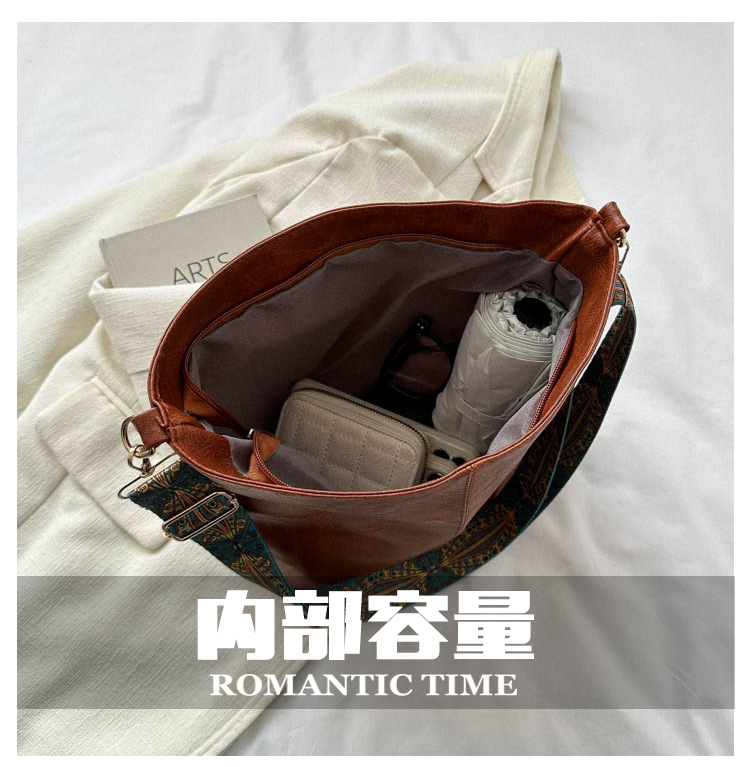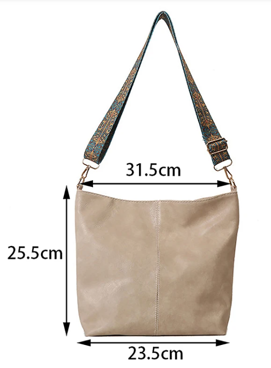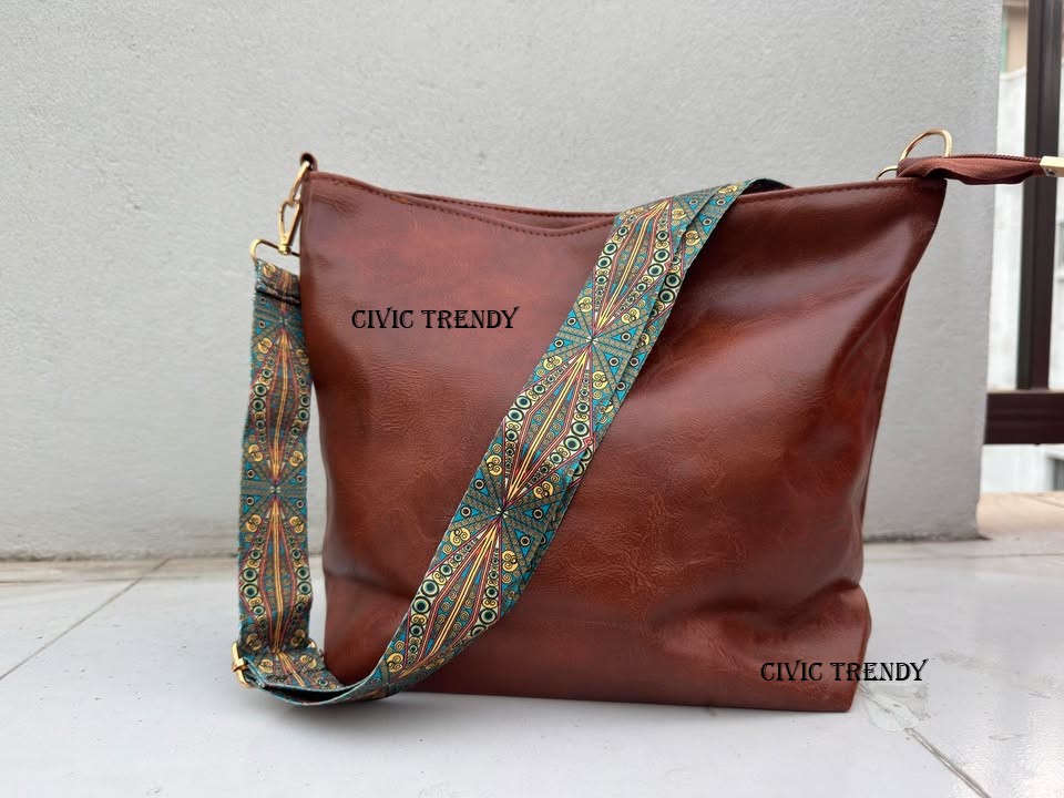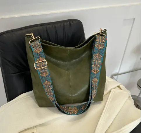 This stylish tote bag is made of durable and lightweight PU leather with a smooth, textured finish. It has a spacious main compartment with a zipper closure and an adjustable, detachable strap that features an intricate, vibrant pattern. The gold-toned hardware adds a touch of elegance to the design, making it suitable for both casual and formal occasions.