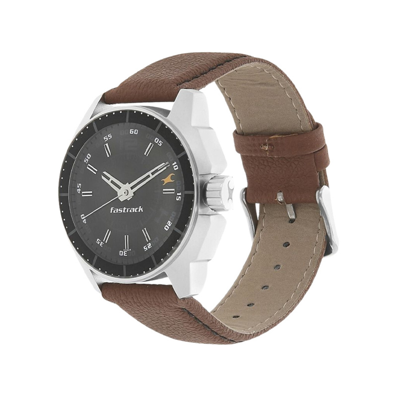 Case style: Analogue watch with a round case and a stainless steel backDial style: Black dialFeatures: A screw to reset timeStrap style: Brown bracelet style strap secured with a tang claspWater-resistant up to 50 mComes in a signature Fastrack case.