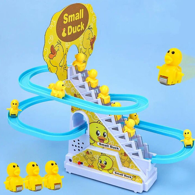 Small Duck Slide Toy,Electric Duck Climbing Stairs Tracks Slide Toy Set,Duck Roller Coaster Toy with Flashing Lights & Music On/Off Button, 01
