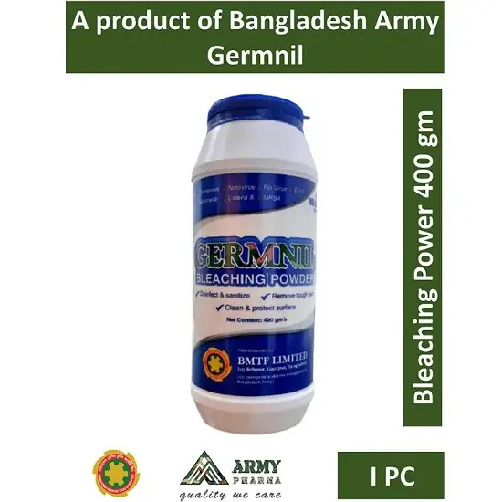 Germnil Bleaching Powder (400 gm), produced by Bangladesh Machine Tools Factory (BMTF), is a powerful cleaning and disinfecting agent designed for multi-purpose household and industrial use.