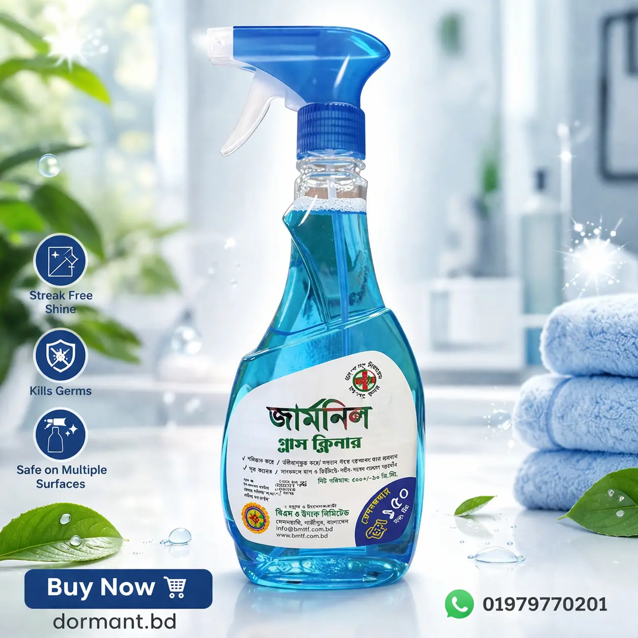 Germnil Glass Cleaner (500 ml), produced by Bangladesh Machine Tools Factory (BMTF) under the supervision of the Bangladesh Army, is a professional-grade cleaning solution designed to keep glass and reflective surfaces spotless.
