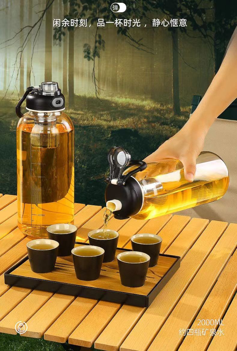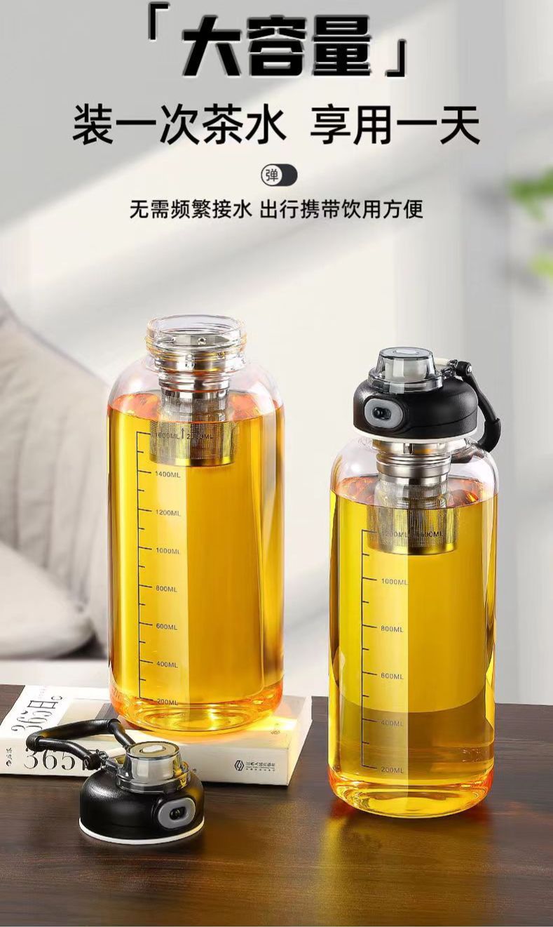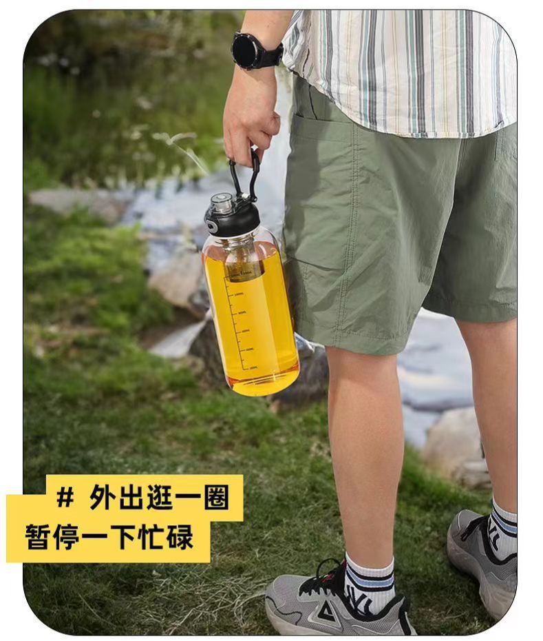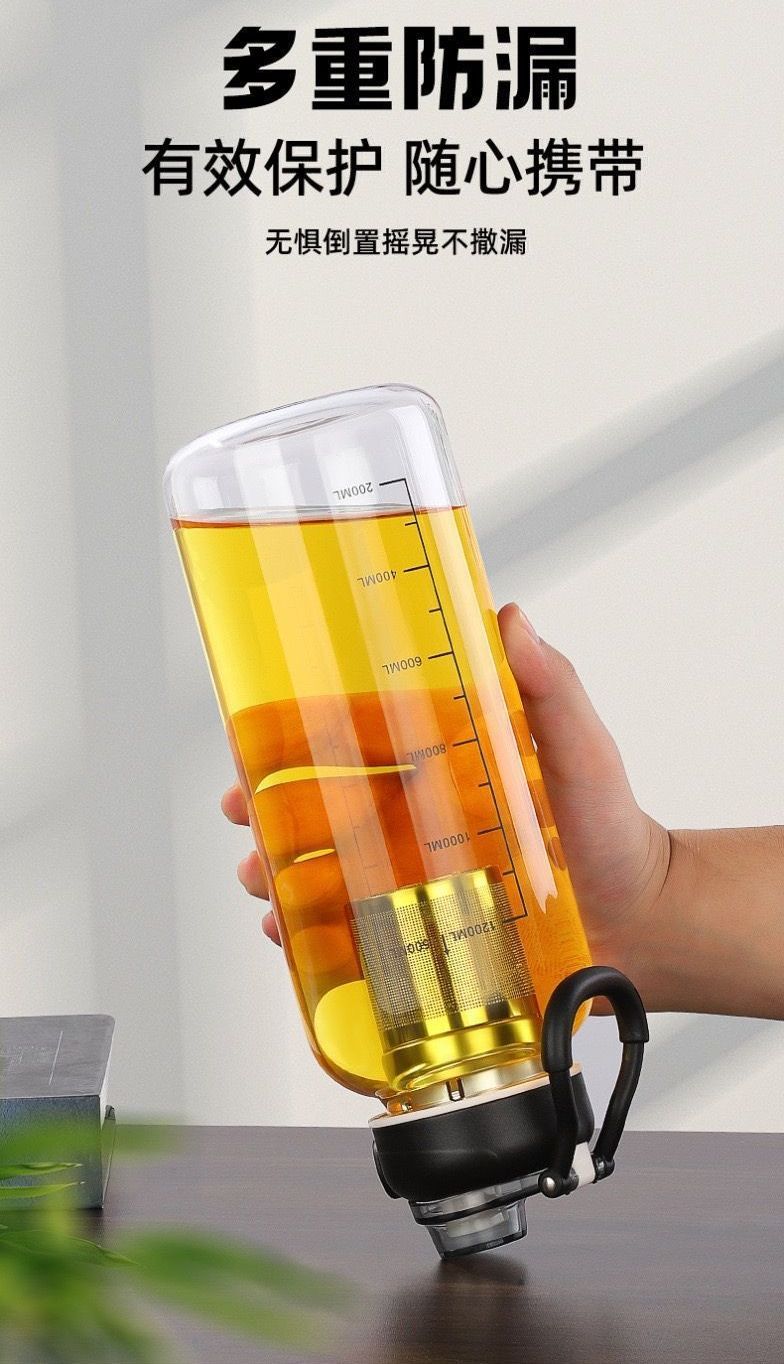 glass Water Bottle with Time Marker Creative Large Capacity Leakproof Drink Bottle(1000ml wooden lid)