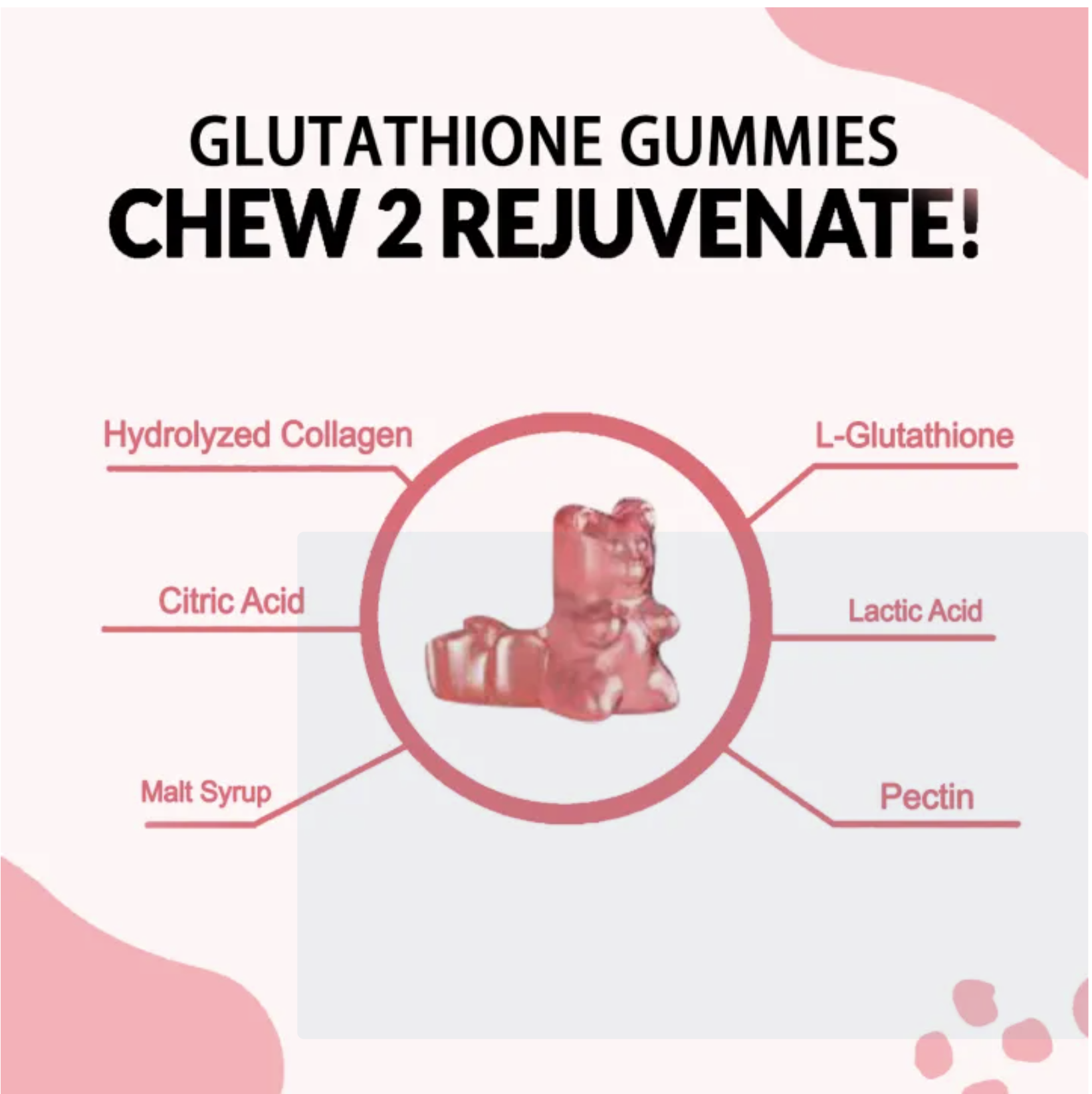 Each Gummy Contains: 500MG L-Glutathione , 50 MG MG Collagen, 50MG Vitamin C, 100 IU Vitamin E, 140 MG Folic Acid, 425 MG Vitamin B12 in each gumi.