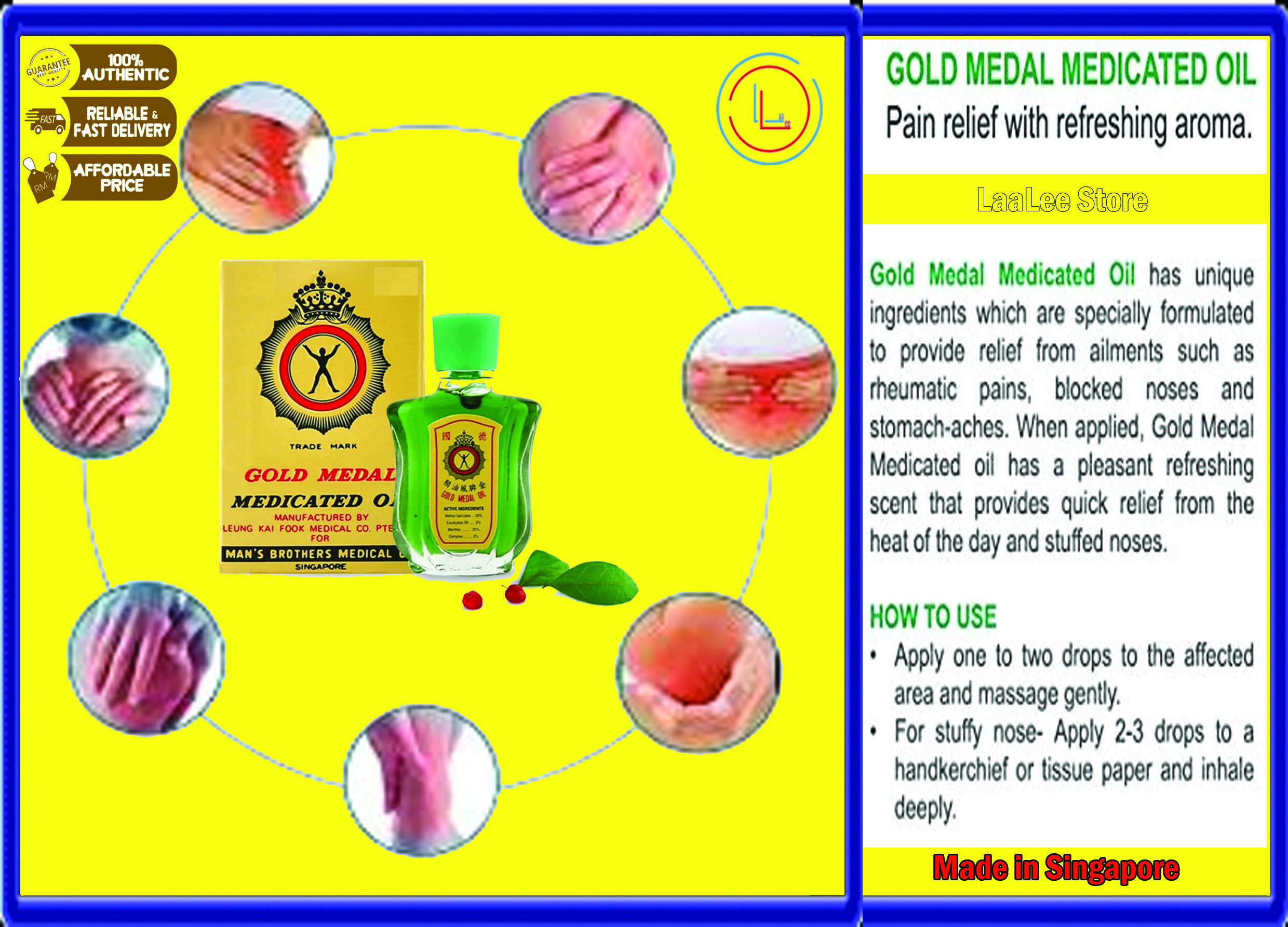 - Gold Medal Medicated Oil It'S An Orginal Product From Singapore Made Up Of Unique Formula Renowned From Over The Decades Globally. Its Unique Ingredients Are Intended To Provide Relief From Ailments Such As Blocked Nose, Rheumatic Pain.
