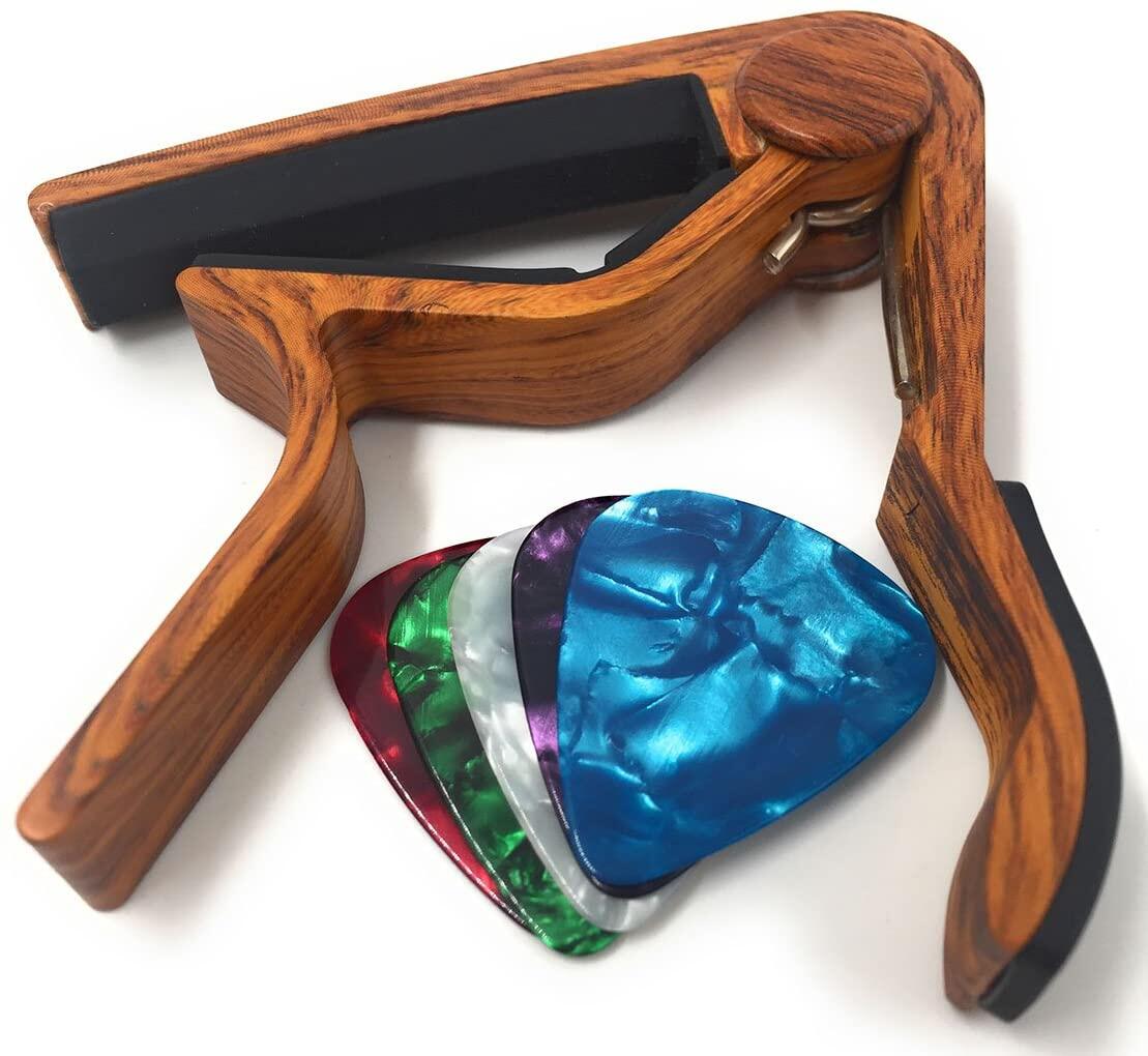 - ✔︎What you get: Unique beautiful wood finish capo with 5 medium picks which are shipped by random,might not the same color as the picture,but the same quality and also super beautiful. Rock & Roll with this capo,and it comes with lifetime warranty.