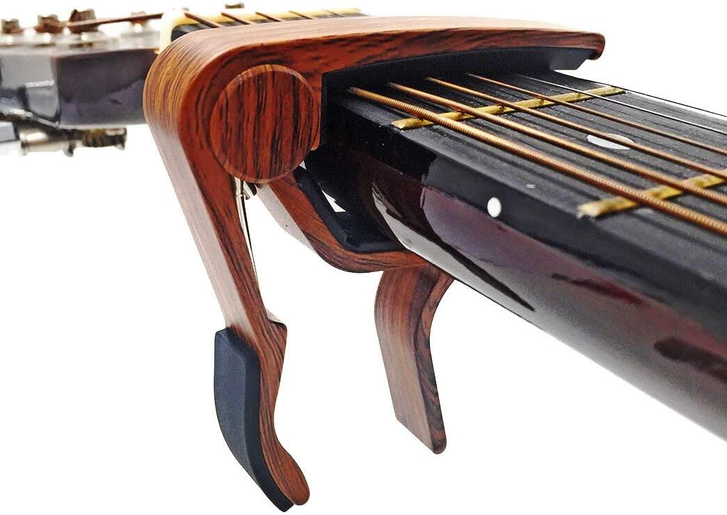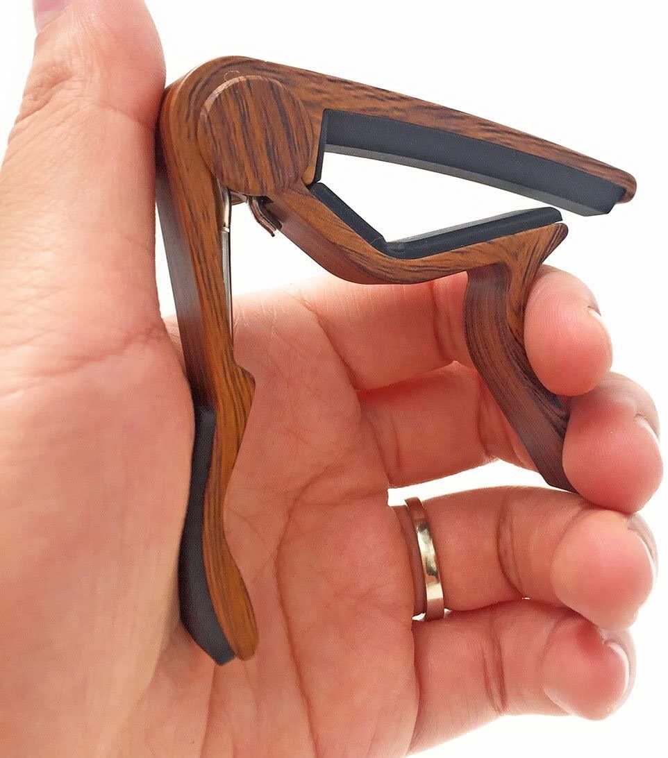 The rosewood construction not only adds a touch of sophistication but also ensures durability and a comfortable grip. The capo's precision mechanism allows for smooth and accurate pitch changes, maintaining tuning stability across various guitar necks. The included picks, featuring a variety of thicknesses and styles, complement the capo by enhancing your playing versatility.