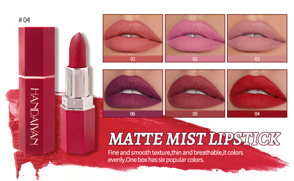 Introducing the HANDAIYAN Cream Matte Lip Stick Set, a captivating fusion of creamy luxury and enduring elegance. IElevate your lip game with HANDAIYAN's Cream Matte Lip Stick Set, where each piece is a stroke of indulgence. Unleash your bold elegance, making a statement with enduring lip color. Note: Actual shades may vary slightly due to lighting effects and computer screen color variations.