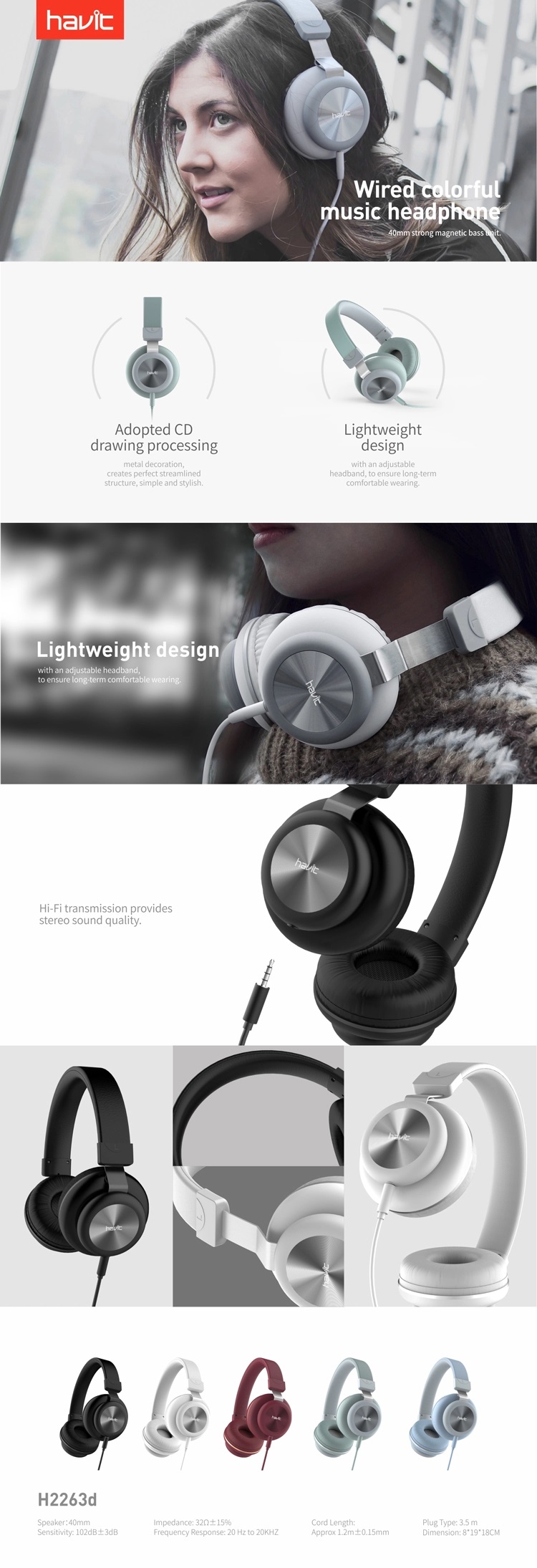 The Havit H2263D 3.5mm Metal Decoration Headphone has metal decoration which creates a perfect streamlined structure and makes it simple and stylish. The lightweight design with an adjustable headband ensures long-term comfortable wearing. This headphone has a Hi-Fi transmission that provides stereo sound quality.