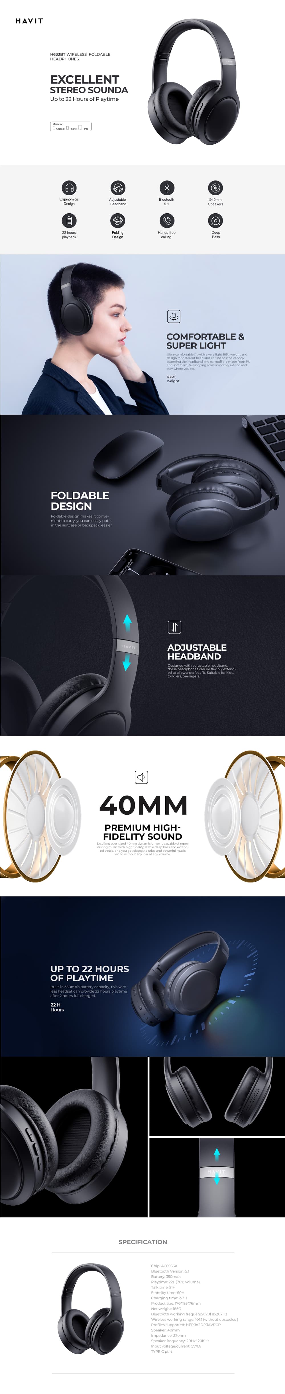 HAVIT H633BT BLUETOOTH FOLDABLE STEREO HEADPHONE