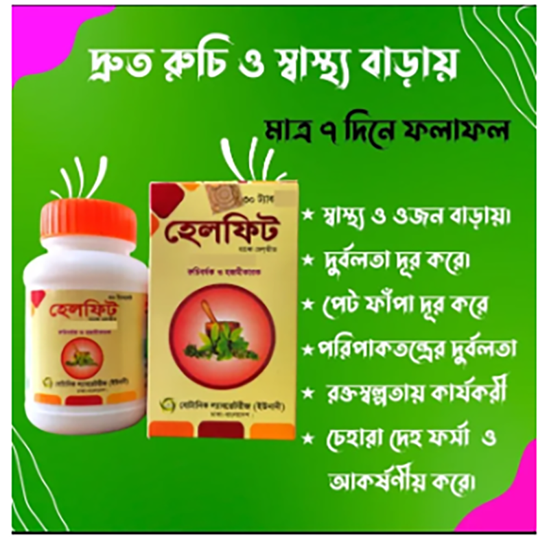 - Helfit== Flatulence, appetizer, anorexia, Deficiency, vitamin a,c,e mineral and salt.Degestive weakness, weakness of smooth and anamia.Chronic constipation. Dosage:: adults , Take 1 tablet twice a day after meals in the morning and at night.