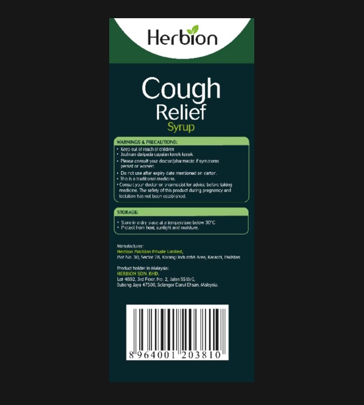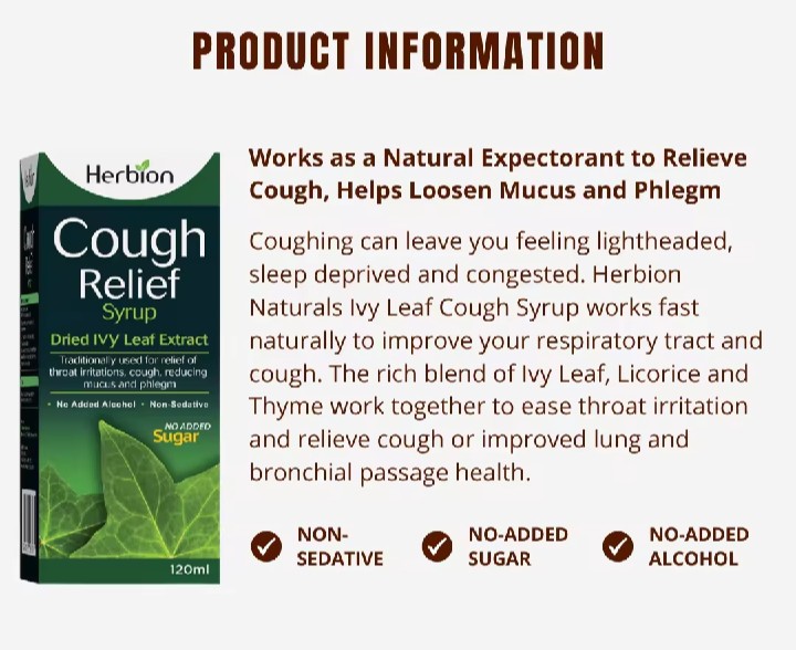 Buy Herbion Cough Relief Syrup with Dried Ivy Leaf Extract 120ml. This Syrup is formulated with English Ivy and Thyme that provide effective natural cough relief. Herbion Naturals Ivy Leaf Syrup with Thyme soothes respiratory discomfort, maintains bronchial health and supports healthy mucous membranes.