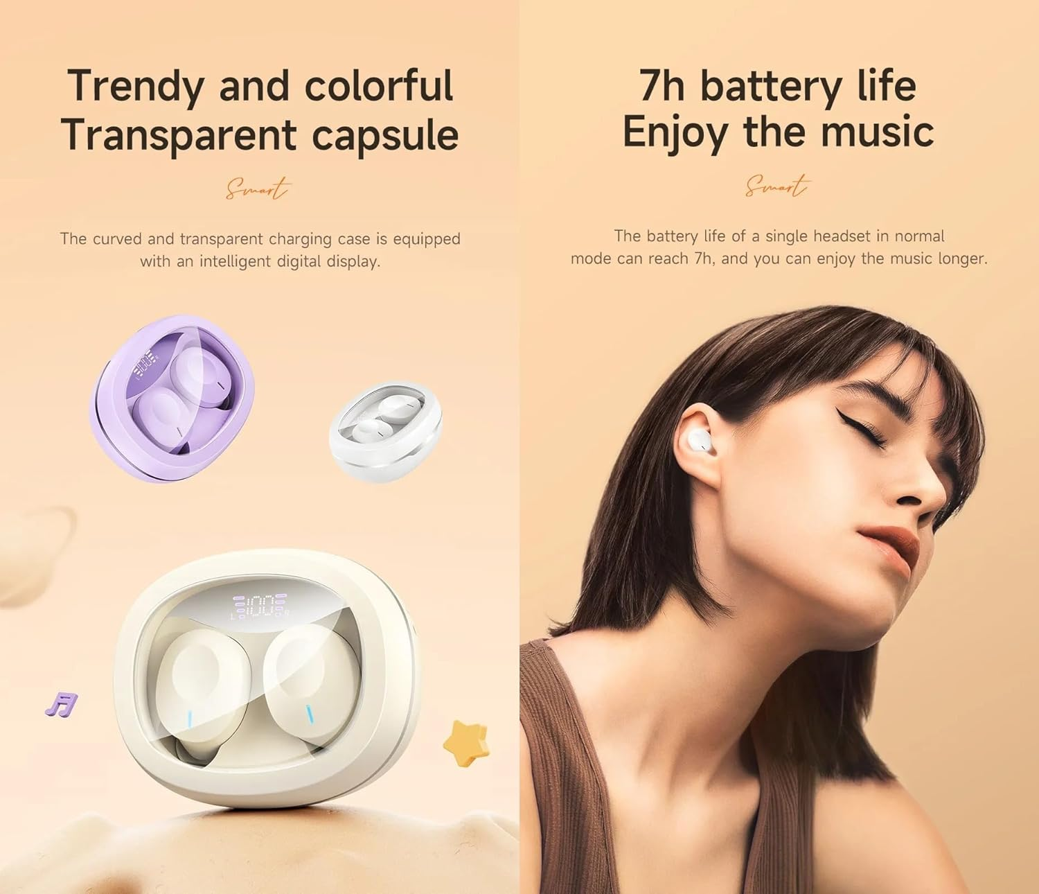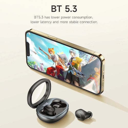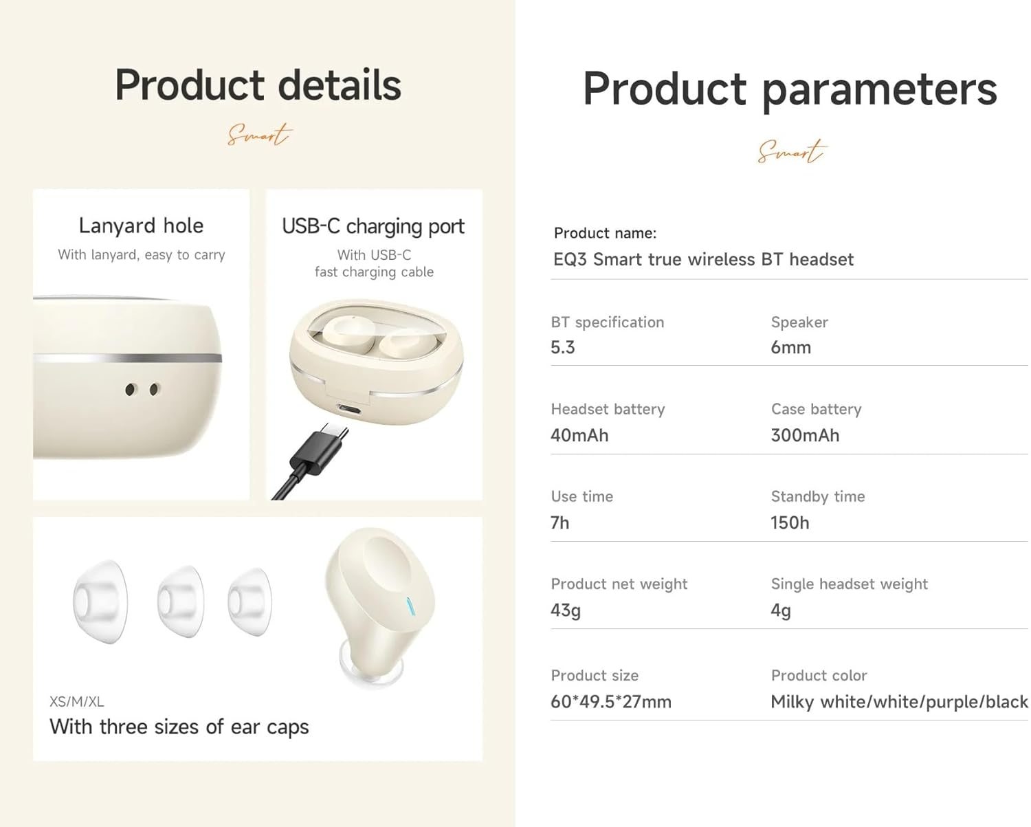1. BT version: v5.3. Chip: JL AC6983D2.2. Supported protocols: Headset, Hands-free, A2DP, AVRCP.3. Transmission distance: 10m.4. Transmission frequency: 2.4Hz.5. Speaker unit: 6mm.6. Impedance: 32Ω ± 15%.7. Frequency response: 20-20000Hz.8. Sensitivity: 95dB ± 3dB.9. Battery capacity: charging case 300mAh, headset 40mAh.10. Charging case input: DC5V, Type-C.11. Charging time: about 1.5 hours for charging case, about 1 hour for headset.12. Talk / music time: 7 hours (80% volume). Standby time: 150 hours.13. LED digital display of power level. Transparent charging case cover.14. Supports leader-follower switching, voice assistant activation, songs switching, songs play / pause.15. Headset automatically turns on when taken out from the charging case, automatic pairing. Headset automatically turns off when placed into the charging case.16. Battery display: supports for Apple phones and some Android phones.17. Sizes: 60 × 49.5 × 27mm.18. Total weight: 43g. Single earbud weight: 4g.
