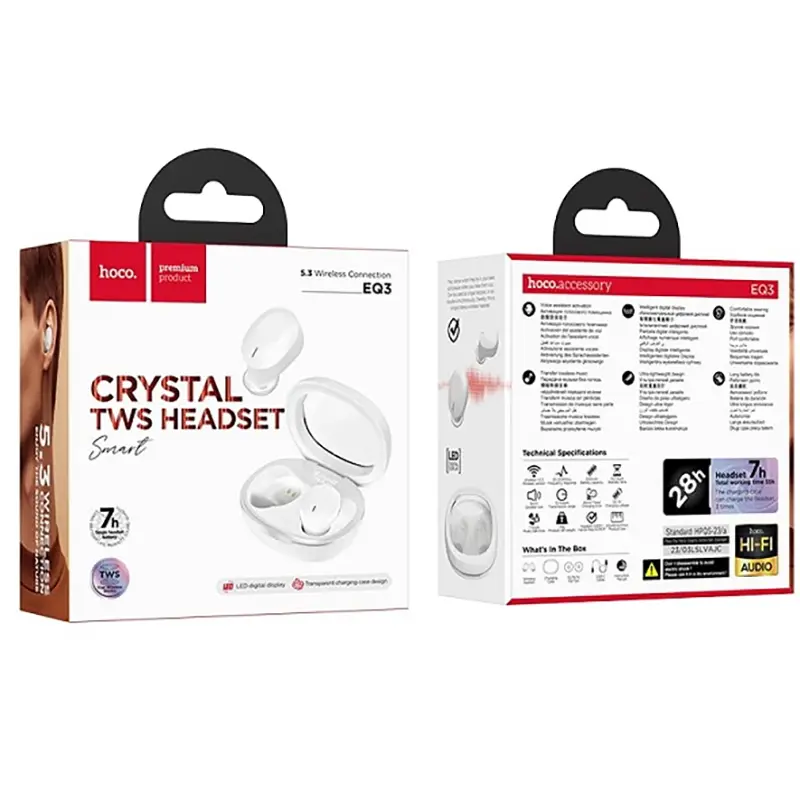 BT version: v5.3. Chip: JL AC6983D2.2. Supported protocols: Headset, Hands-free, A2DP, AVRCP.3. Transmission distance: 10m.4. Transmission frequency: 2.4Hz.5. Speaker unit: 6mm.6. Impedance: 32Ω ± 15%.7. Frequency response: 20-20000Hz.8. Sensitivity: 95dB ± 3dB.9. Battery capacity: charging case 300mAh, headset 40mAh.10. Charging case input: DC5V, Type-C.11. Charging time: about 1.5 hours for charging case, about 1 hour for headset.12. Talk / music time: 7 hours (80% volume). Standby time: 150 hours.13. LED digital display of power level. Transparent charging case cover.14. Supports leader-follower switching, voice assistant activation, songs switching, songs play / pause.15. Headset automatically turns on when taken out from the charging case, automatic pairing. Headset automatically turns off when placed into the charging case.16. Battery display: supports for Apple phones and some Android phones.17. Sizes: 60 × 49.5 × 27mm.18. Total weight: 43g. Single earbud weight: 4g.