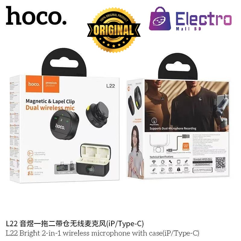 - Experience professional-grade audio recording with the Hoco L22 Magnetic & Lapel Clip Dual Wireless Microphone, perfectly crafted for vloggers, streamers, teachers, and mobile creators who need crystal-clear sound anytime, anywhere. With ENC noise cancellation, dual mic setup, and universal compatibility, itβs your go-to gear for high-quality content creation.