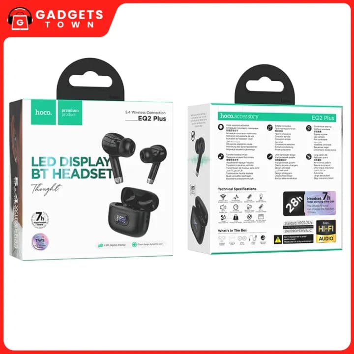 Enjoy up to 7 hours of continuous playtime and 28 hours total with the included USB‑C charging case—perfect for full-day usage. Features like smart touch controls and automatic pairing enhance usability, while a digital battery indicator keeps you in the know. Lightweight, ergonomic design ensures comfortable fit for long listening sessions. With impressive battery life, quality audio, and modern connectivity, the Hoco EQ2 Plus is the value-packed choice for everyday tech needs.