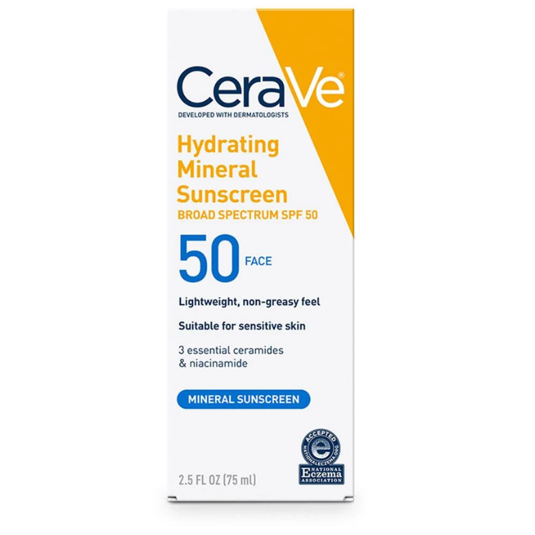 CeraVe Hydrating Mineral Sunscreen SPF 50 Face Lotion is a gentle, dermatologist-developed, non-comedogenic facial sunscreen that offers powerful protection against the sun’s harmful UVA and UVB rays while simultaneously helping to restore and maintain your skin’s natural protective barrier. This fragrance-free, oil-free mineral sunscreen is formulated with broad-spectrum SPF 50 using 100% mineral-based active ingredients — zinc oxide and titanium dioxide — to reflect and scatter harmful rays from the skin’s surface rather than absorbing them, making it ideal for sensitive or reactive skin.