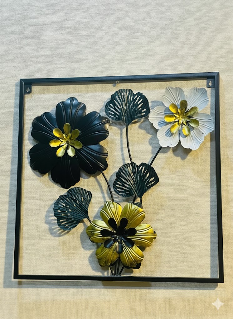 Elevate your living space with this sophisticated piece of contemporary wall decor. This handcrafted metal art features a delicate arrangement of blooming flowers and textured ginkgo-style leaves, all encased within a sleek, minimalist rectangular frame.