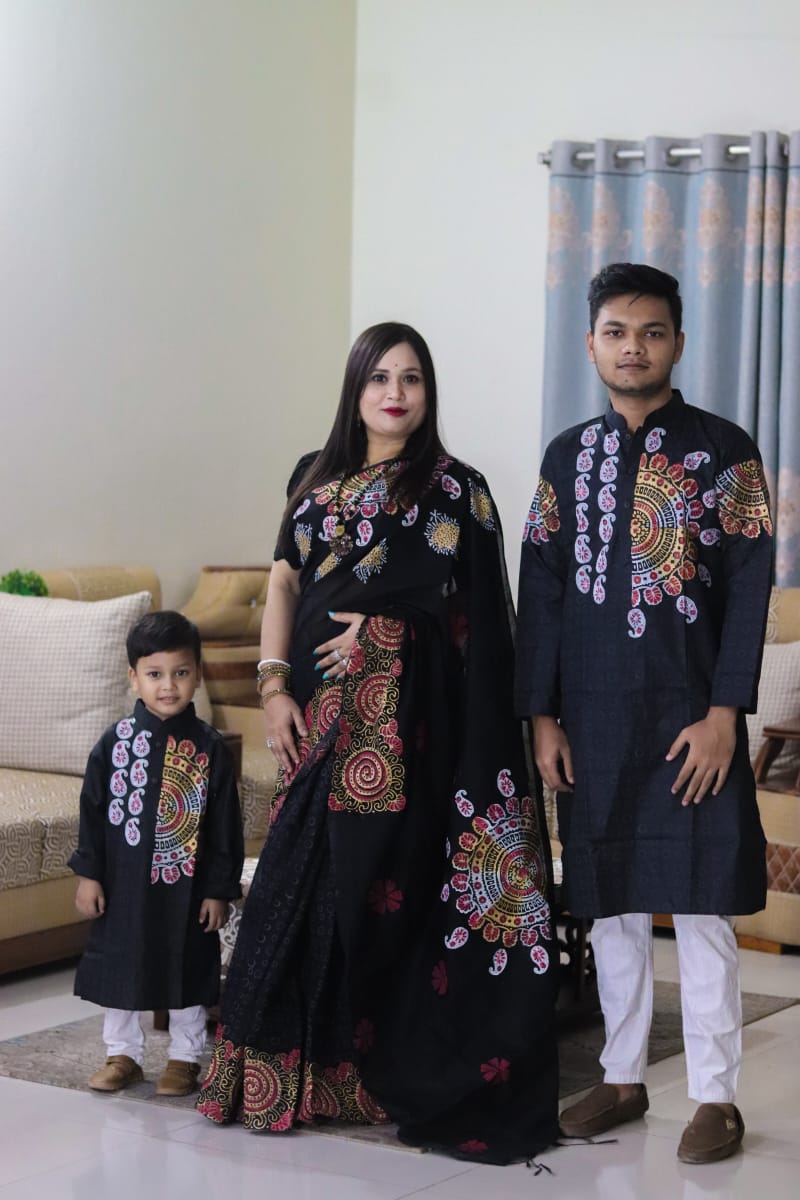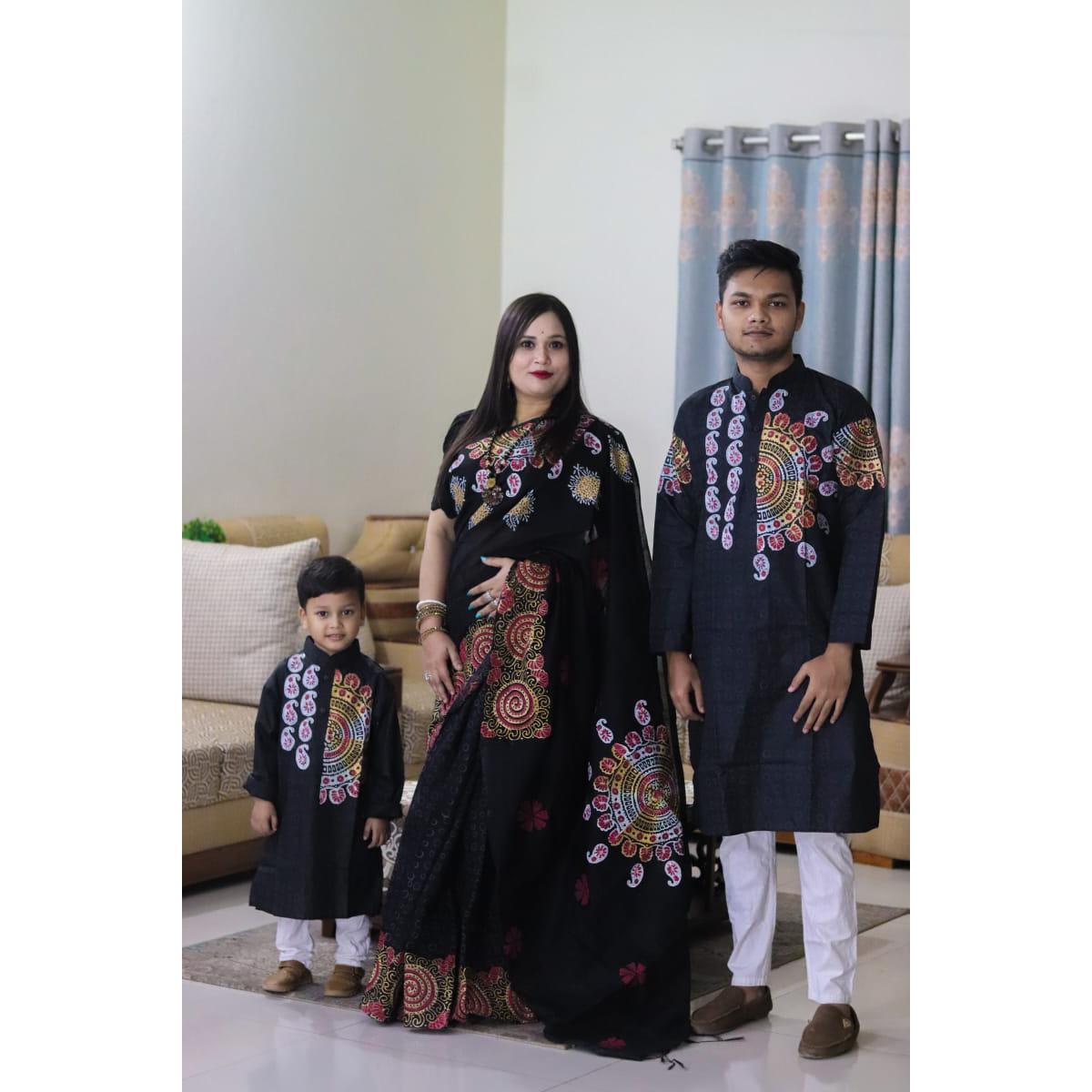 Indispensable -Family Set Block Print Dhupian Silk Exclusive Couple Dress Deep Black Color Saree and Panjabi for Men women and Son- Innovative - Black