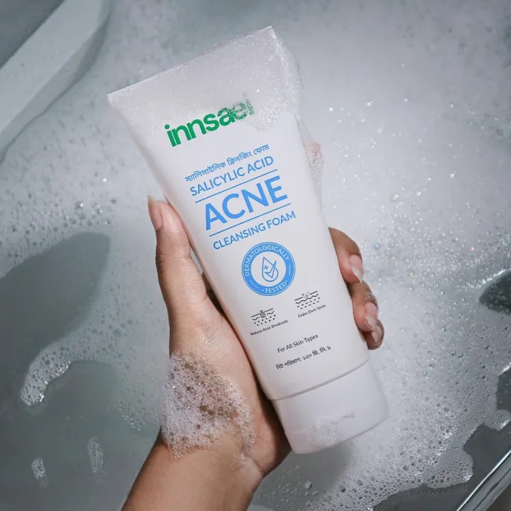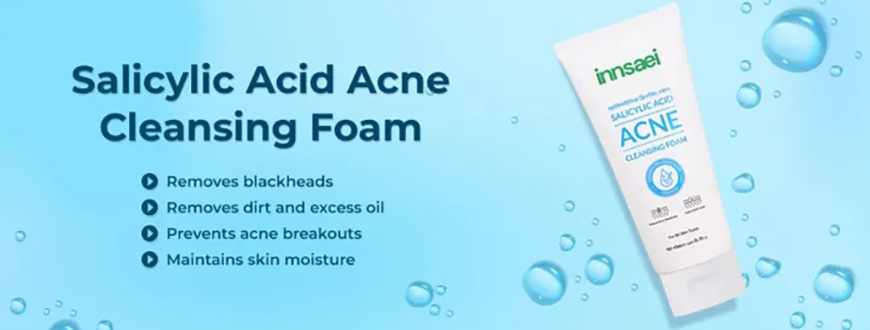 Kickstart and conclude your day with innsaei Salicylic Acid Acne Cleansing Foam. Squeeze a dab onto your wet hand and foam up. Gently massage the face.Rinse with lukewarm water.