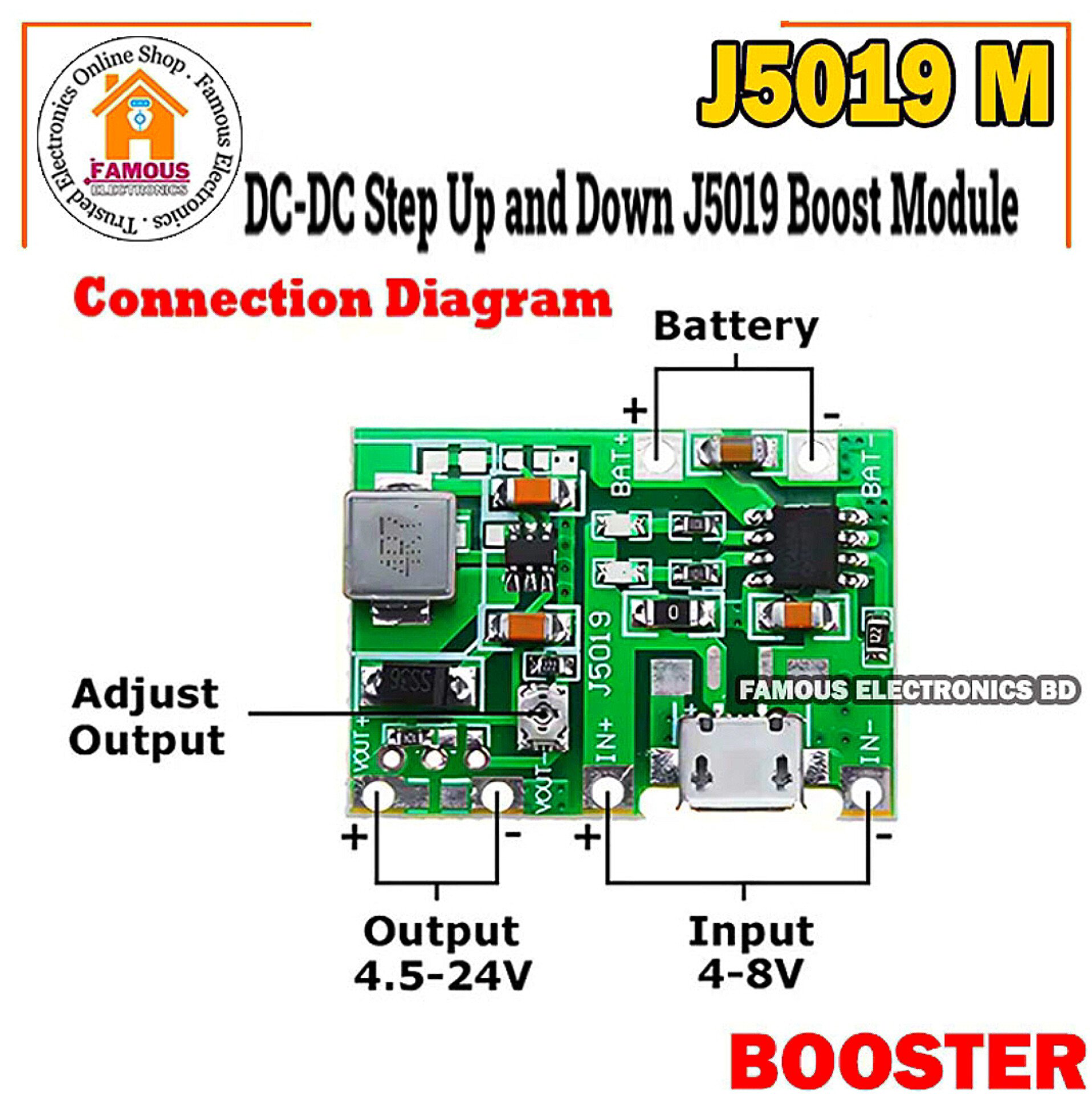 - Lithium Li-ion 18650 3.7 Volts 4.2 Volts Battery Charger Board with DC-DC Step Up Boost Module J5019 module is a small single cell lithium battery charging module which also includes a 1 Ampere step-up (boost) converter for powering a large range of applications. The module will charge most types of single cell (3.7 V) LiPo batteries from either 4 to 8 Volts power supply input, or from a standard 5 Volts USB port/adapter. A battery charge and standby LED is also included for visual indication. Besides battery charging capabilities this module also includes an adjustable boost converter which is capable of stepping up the attached battery voltage from 4.5 to 24 Volts with a maximum supply current of 1 Ampere.