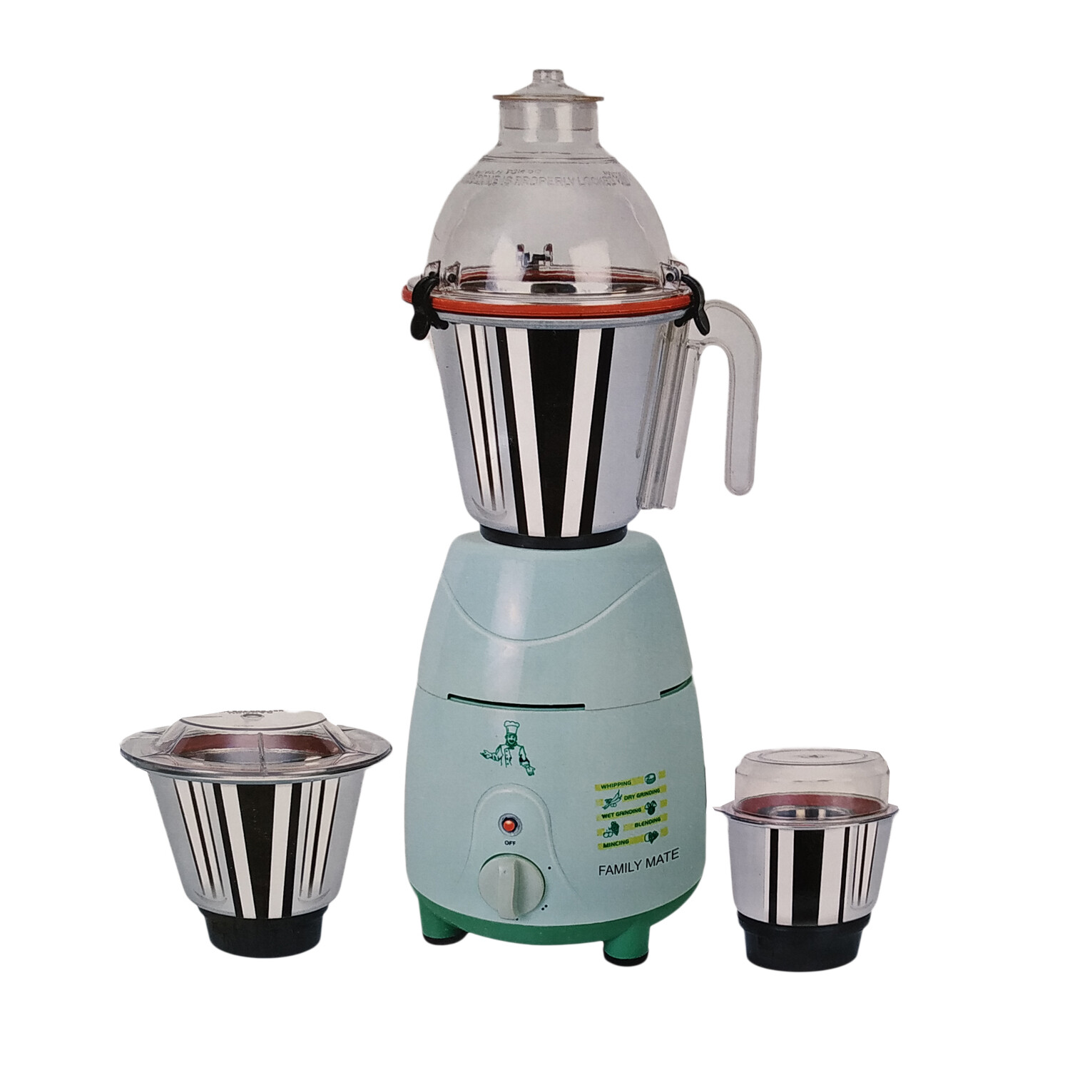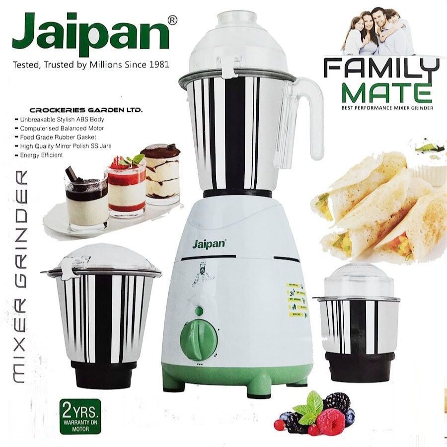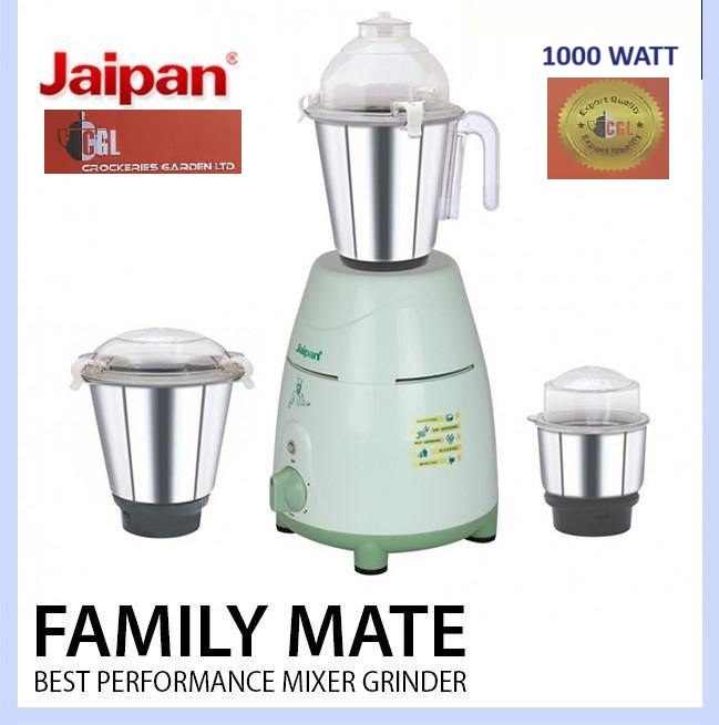 Product Type: All Purpose Grinder and Blender, Brand: Jaipan, Model: Family Mate, Made in India, 2 years service warranty, Original CGL Varient, Best Performance Mixer Grinder, Unbreakable Stylish ABS Body and Computerized Balanced Motor, Food Grade replaceable Rubber Gasket, High Quality Mirror Polish SS Jars, Energy Efficient, Voltage: 230VAC, 50Hz 850WT, Universal HeavyDuty powerful 1000 watts motor, Dynamically Balanced and ergonomic design, Jar and Blade both Stainless Steel, 3 Speed controller With Incher.