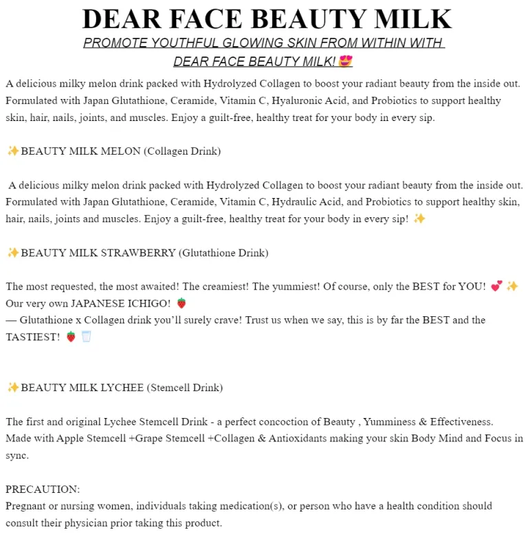 PROMOTE YOUTHFUL GLOWING SKIN FROM WITHIN WITH DEAR FACE BEAUTY MILK! An all in one beautifying, anti aging, brightening collagen / glutathione drink powder that is made from premium ingredients straight from your favorite beauty and skin expert countries, Japan and Korea! FLAVORS: STRAWBERRY (Glutathione Drink)The most requested, the most awaited! The creamiest! The yummiest! Of course, only the BEST for YOU! Anti-aging Brightening Slimming Anti-Oxidant Controls Appetite Whitening Strengthens/Improves skin, hair, nails, cartilages, tendons, musclesUses SteviaPromotes Skin ElasticityImproves sleepSee visible results as early as 30daysSafe for kids 13years old and above Best substitute to Soda Drink Made with fine powder, easily dissolved even in cold water Can be served in cool or hot preparation Collagen is hydrolyzed, easily absorbed by the body 50,000mg of Japan Collagen Packed in a super secured packagingHOW TO PREPARE:In a glass of cold or hot water, mix 1 sachet and stir thoroughly. Take once a day for 1 month straight for best results.️ No Lactose️ No Gluten️ No Artificial FlavorsPRECAUTION:Pregnant or nursing women, individuals taking medication(s), or person who have a health condition should consult their physician prior taking this product.IMPORTANT REMINDER:This dietary supplement is not a medical drug. It is not intended to treat any symptoms of any disease.STORAGE:Keep in cool, dry place away from heat and direct sunlight.
