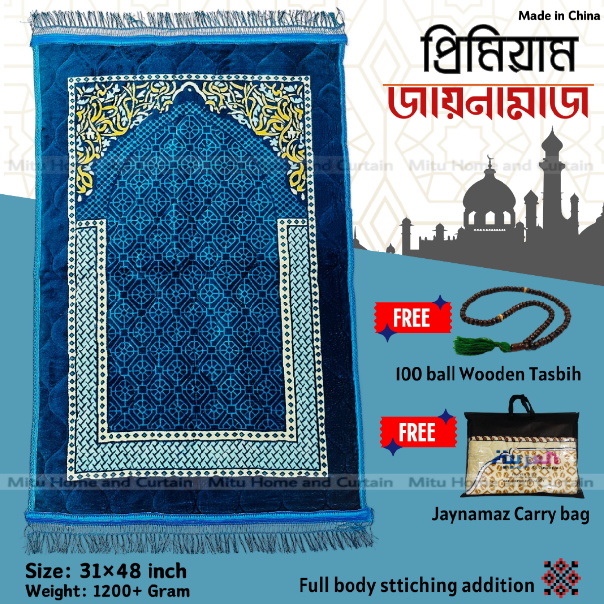 - ● 31 inch * 48 inch Premium quality China Jaynamaz ( Free 100 ball wooden Tasbih)