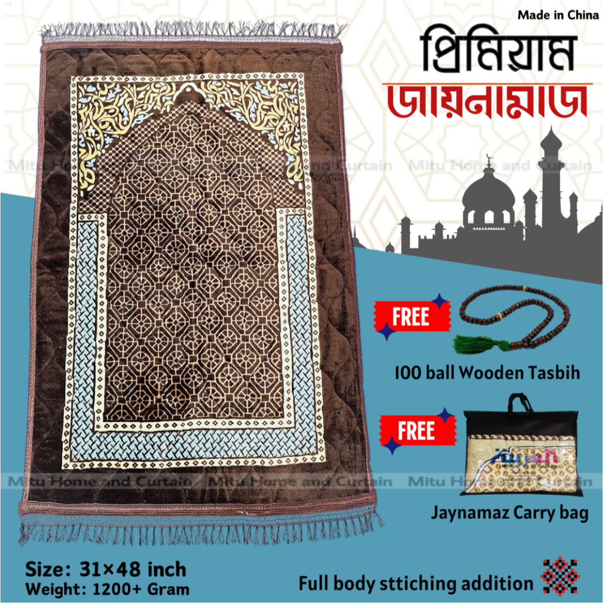 - ● 31 inch * 48 inch Premium quality China Jaynamaz ( Free 100 ball wooden Tasbih)