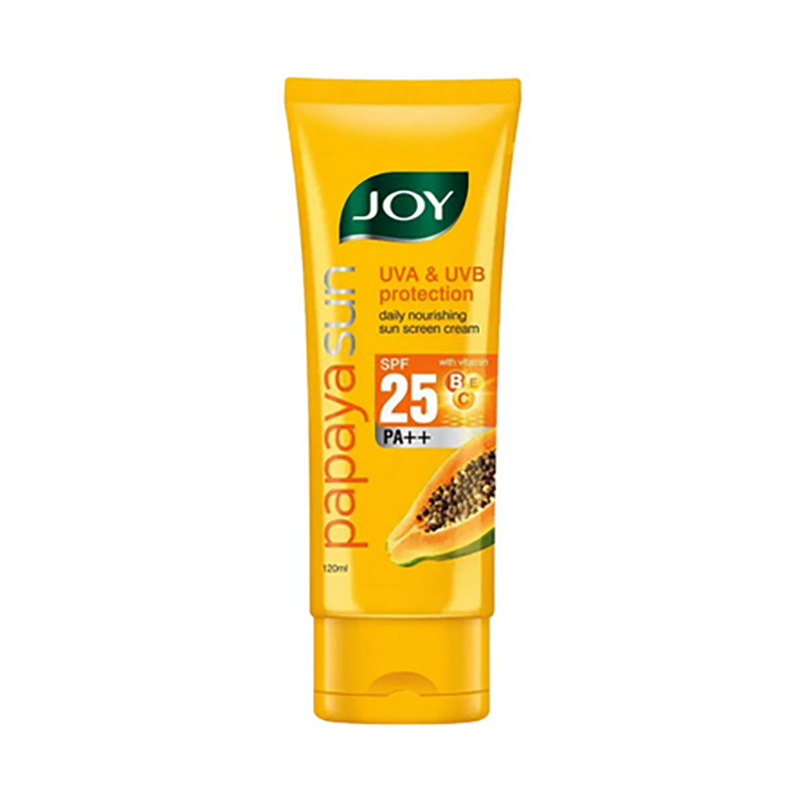 Joy Papaya SPF 25 Sunscreen Cream with UVA and UVB protection is oil-free, fast-absorbing, multi-care cream providing ultimate protection to the skin! Formulated with carefully selected sunscreen agents, vitamins, and natural nutrients, it fights cell damage and melanin overproduction. It provides 25 times more protection from sunburn and darkening. Papaya soothes the skin and provides nourishment and radiance.