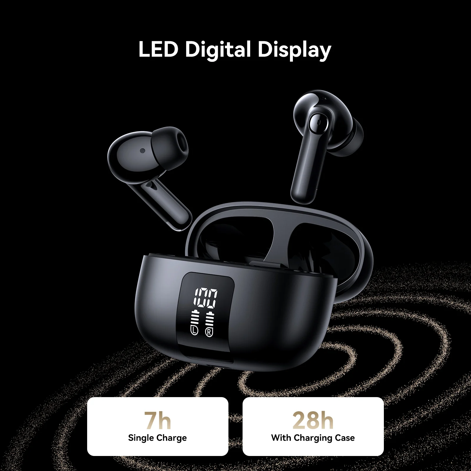 3. Battery level display on charging case (up to 7 hours of playtime on one charge, 28 hours with charging case)