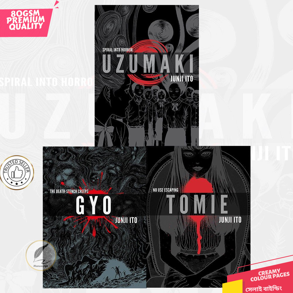 Junji Ito Collection 3 Books Bundles Set Titles In This Set UZUMAKI 3-IN-1 DLX ED HC GYO 2IN1 DLX ED HC Tomie Complete Deluxe Edition Description UZUMAKI 3-IN-1 DLX ED HC Kurouzu-cho, a small fogbound town on the coast of Japan, is cursed. According to Shuichi Saito, the withdrawn boyfriend of teenager Kirie Goshima, their town is haunted not by a person or being but by a pattern: uzumaki, the spiral, the hypnotic secret shape of the world. GYO 2IN1 DLX ED HC The floating smell of death hangs over the island. What is it? A strange, legged fish appears on the scene... Tomie Complete Deluxe Edition Tomie Kawakami is a femme fatale with long black hair and a beauty mark just under her left eye. She can seduce nearly any man, and drive them to murder as well, even though the victim is often Tomie herself.
