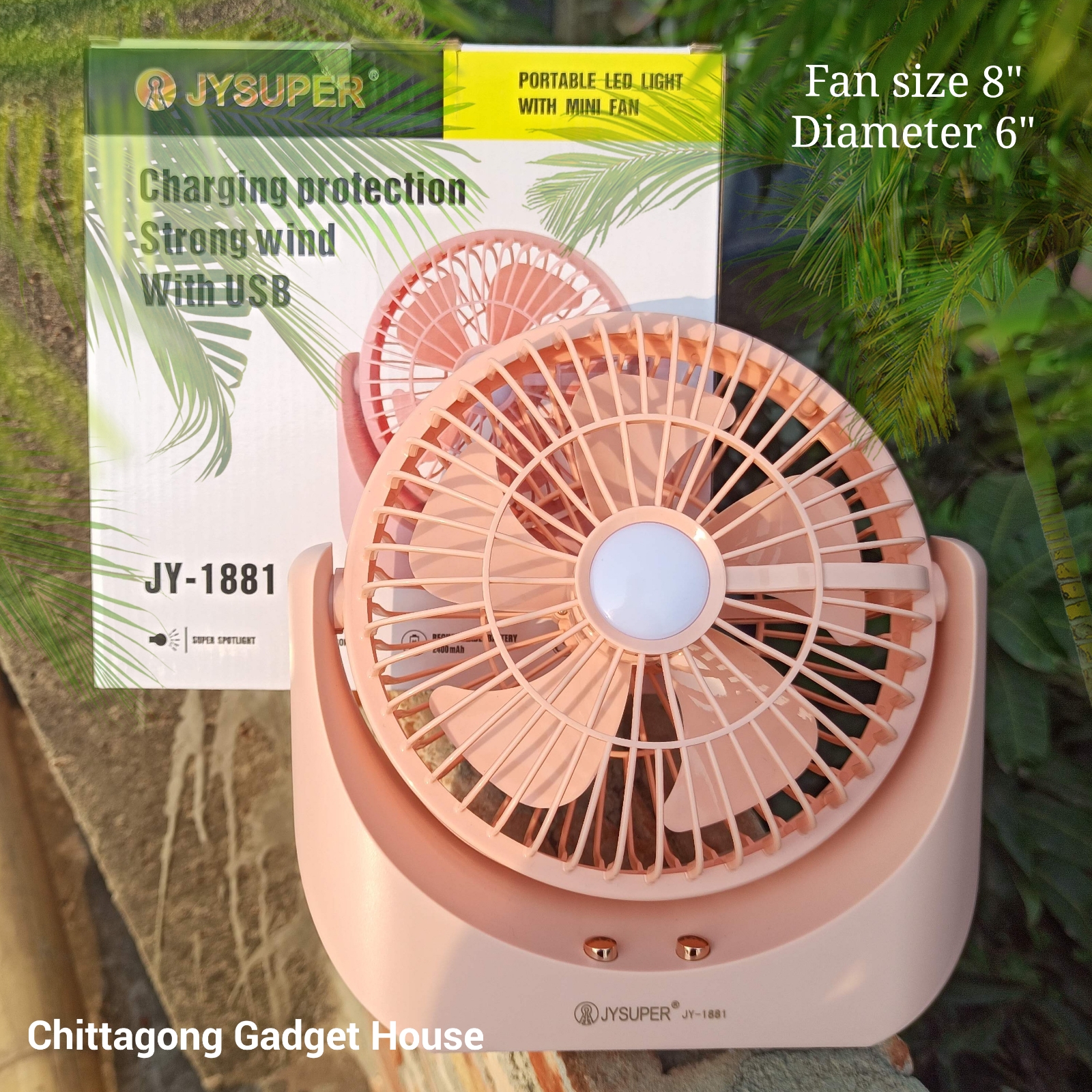 The JY SUPER JY-1881 is a versatile 8-inch rechargeable desk fan with a built-in LED light, designed to deliver strong airflow and reliable lighting. With its up-down adjustable angle and portable design, it’s ideal for home, office, and outdoor use.