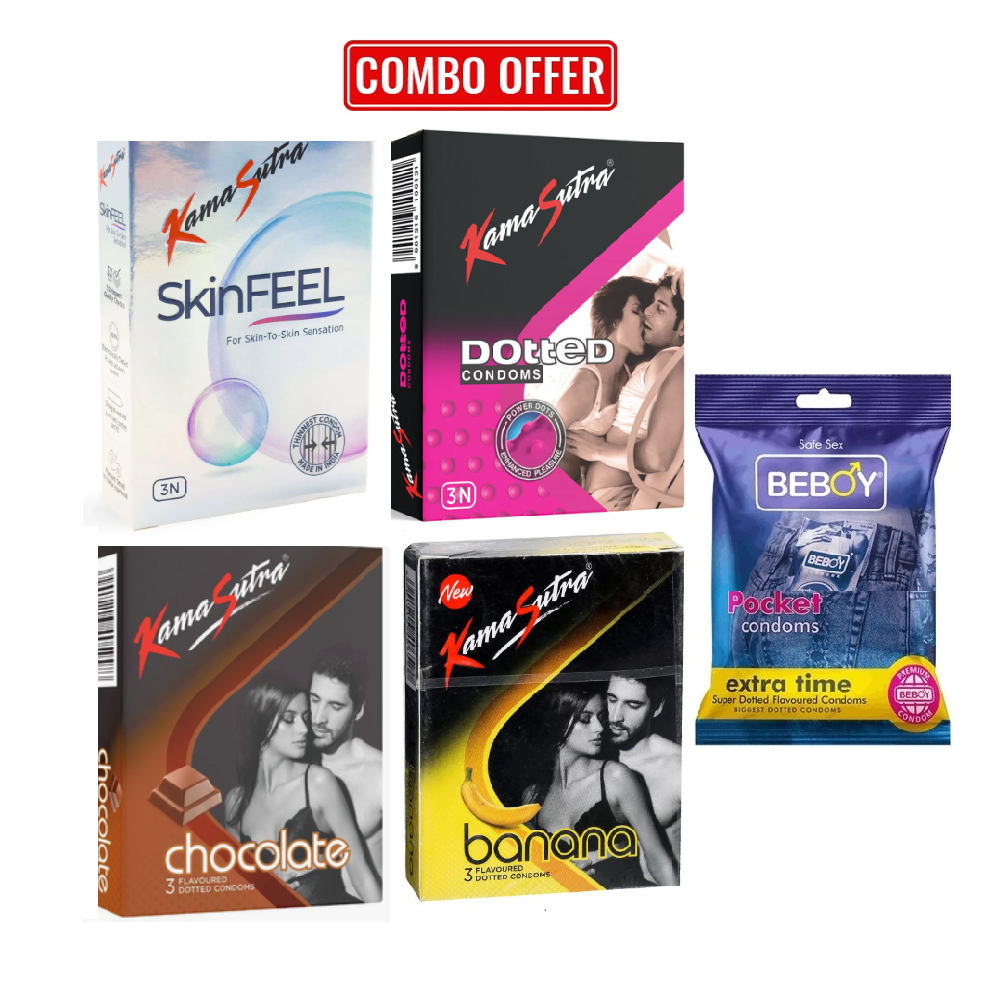 Kamasutra ( Mini Combo ) Skinfeel ,Banana , Chocolate , Dotted , Beboy Extra Time Flavour Condom 3x5 = 15pcs Pack(India)