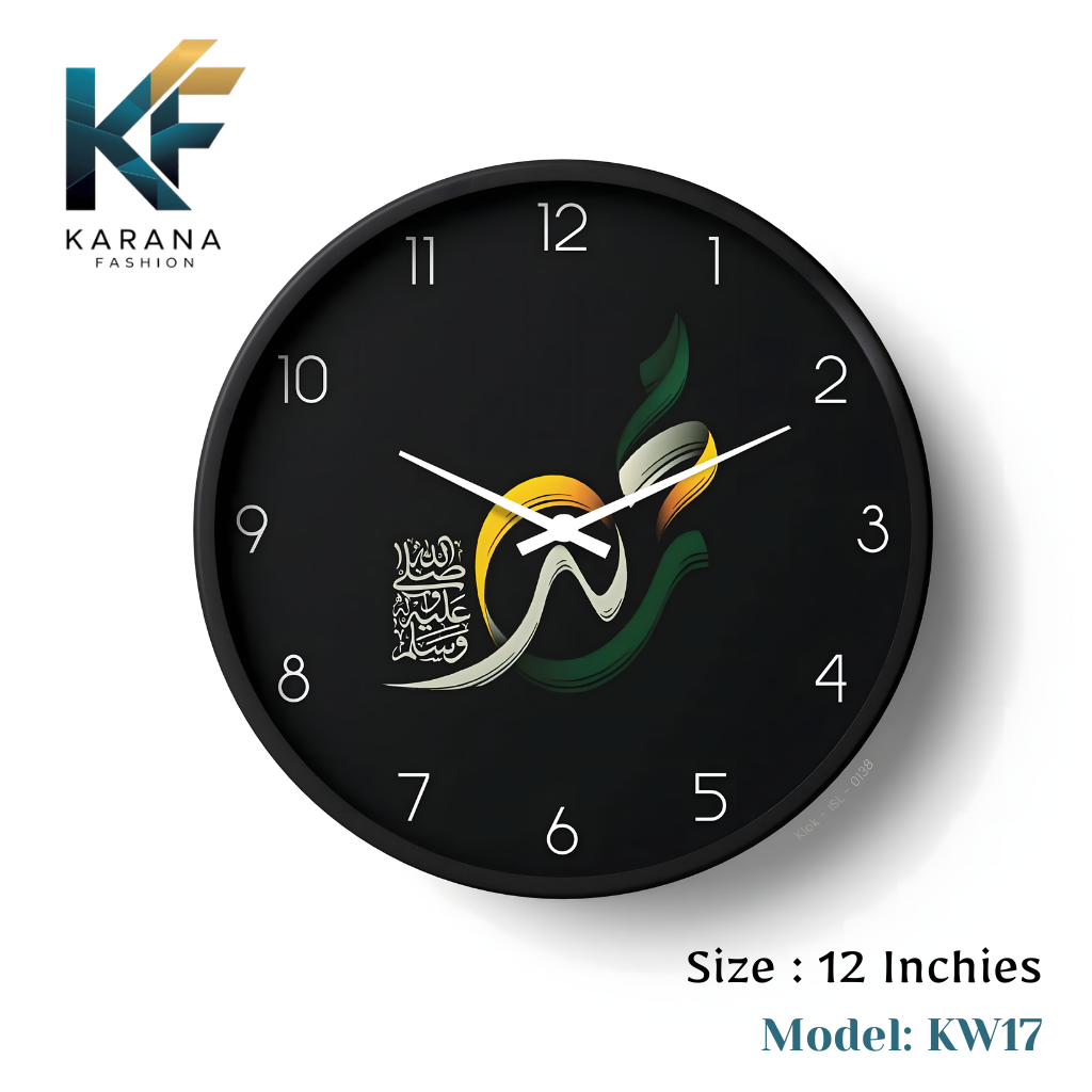 • Introduce a touch of spiritual elegance to your home with the Karana Fashion KW17 Wall Clock. This 12-inch timepiece features a stunning, modern rendition of the name of the Prophet Muhammad (PBUH) in flowing Arabic calligraphy. The artwork is beautifully accented with vibrant green and golden-yellow strokes, symbolizing growth and divinity against a sleek matte black background.