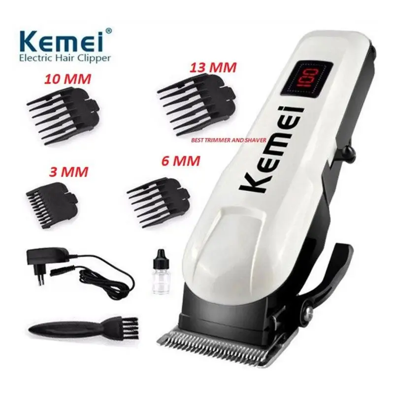 Adjustable trimming length/guide combs: e.g., 4 combs (3mm/6mm/10mm/13mm) listed in one spec.