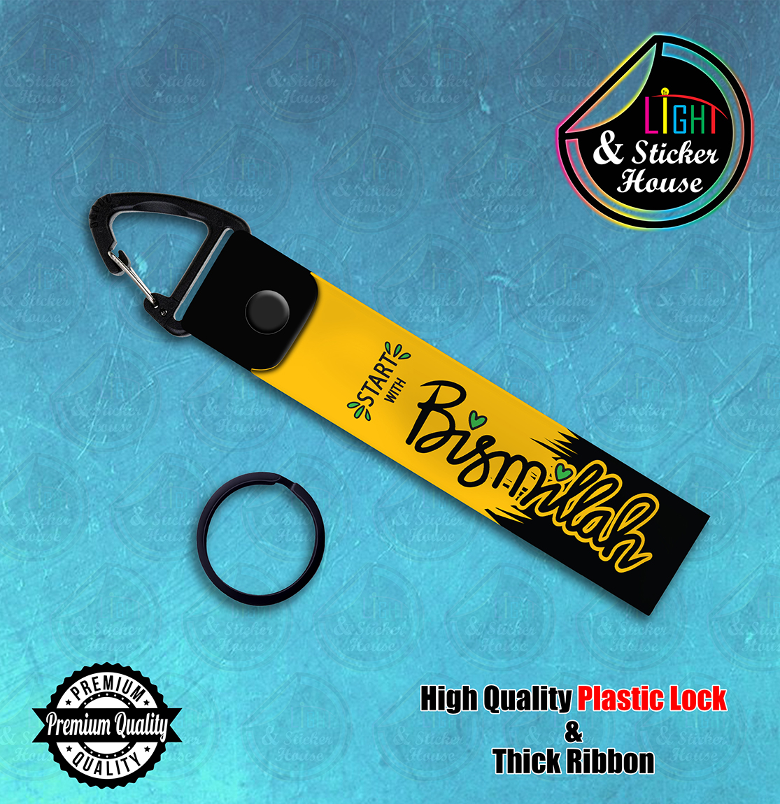 Key ring For Bike user ---- Start With Bismillah_Yellow_Curving ---- Premium Quality & Plastic lock (Attachable to keys for bike, car, bag, home, and office keys)