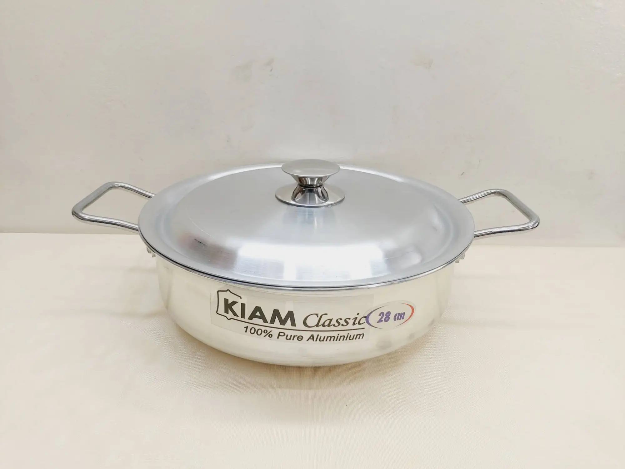 The Kiam Aluminium Wok Pan with Metal Handle - 28 cm is a durable, heavy-gauge aluminum multipan designed for versatile cooking on gas, electric, and infrared stoves. It features a strong metal handle that resists fire and is easy to clean.