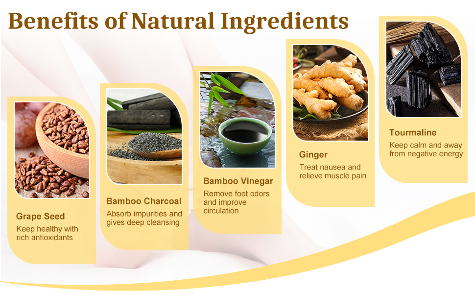 - [Natural Way to Clean] : Natural ingredients in this foot pads relieve pain and tension, promote deeper sleeping.Remove Body Toxins and Odor.