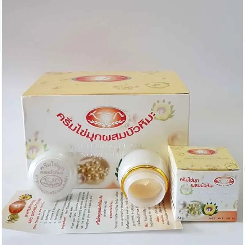 - Made In: Thailand• The most important features of this cream• It can be used for following purposes:• Whitening• Pimple & Spot removing• Moisturizing• Intensive Anti-wrinkles treatm• Softening• Brand : kim• Condition: 100% Authentic brand new, Never open• Total Quantity : 1 piece• Net weight: 20 g.• How to use• At first, Wash your face, Everytime before putting make-up in the morning and before going to bed, massageà the whitening pearl and snowlotus cream accross your entire face and neck.