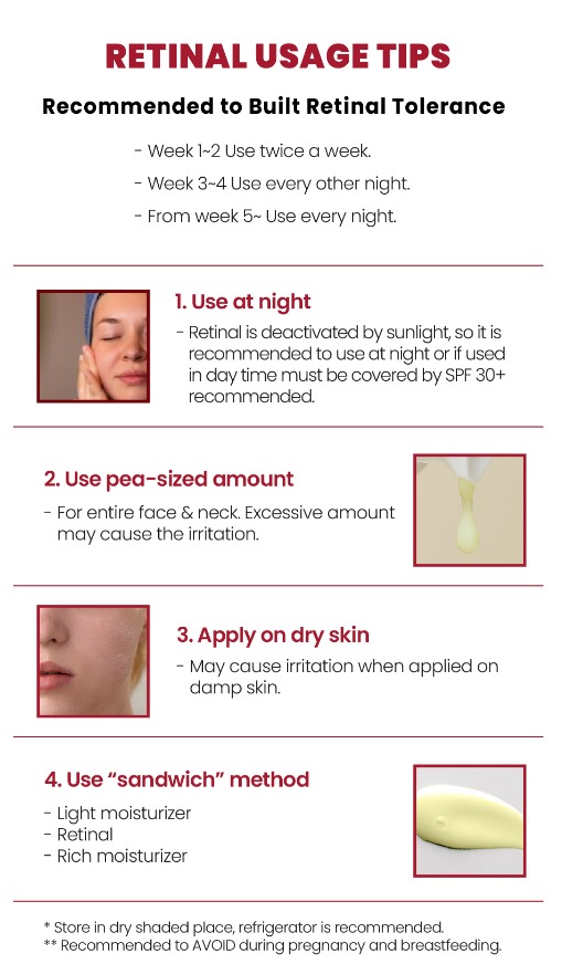 - 1. Apply a pea-sized amount to your skin as the last step of your nighttime skincare routine. 2. If you're new to retinal, we recommend starting with 2-3 uses per week. You may gradually incease the amount or frequency if you'd like.